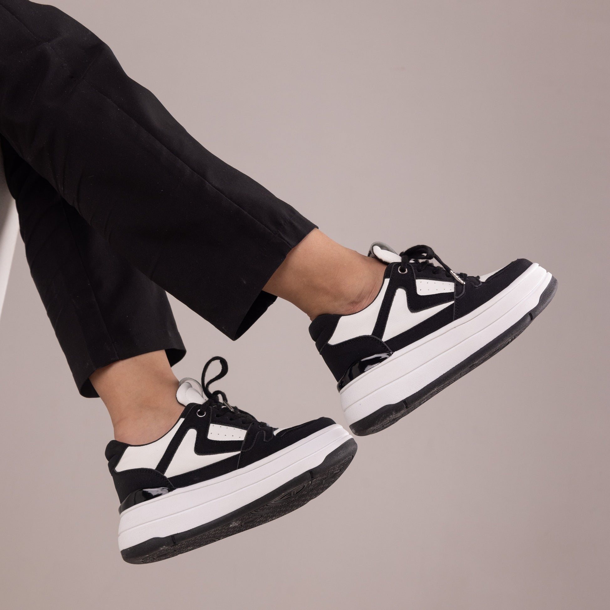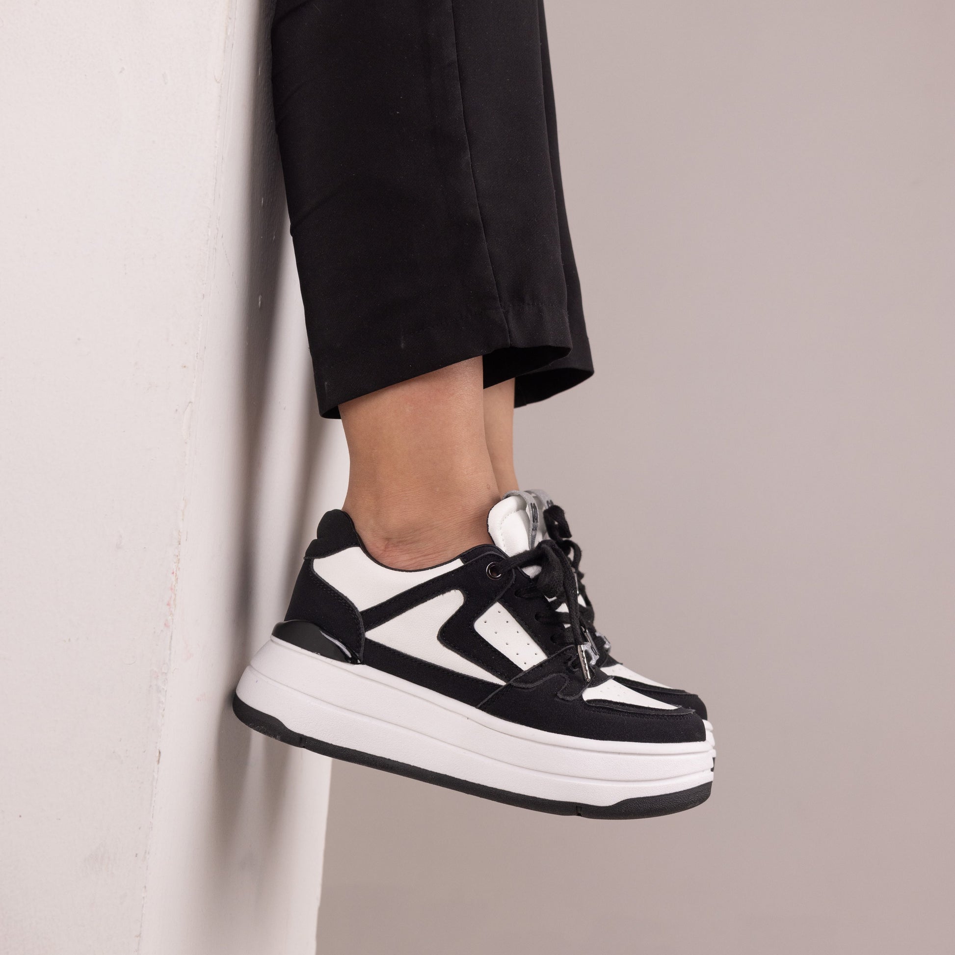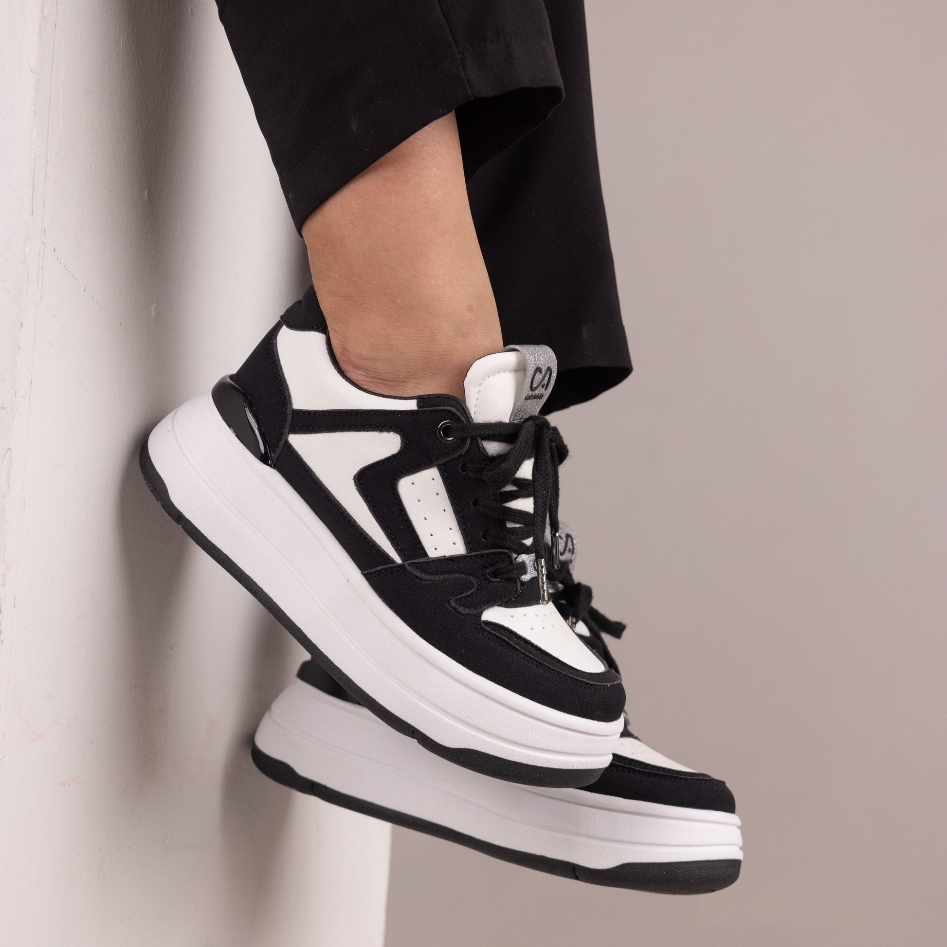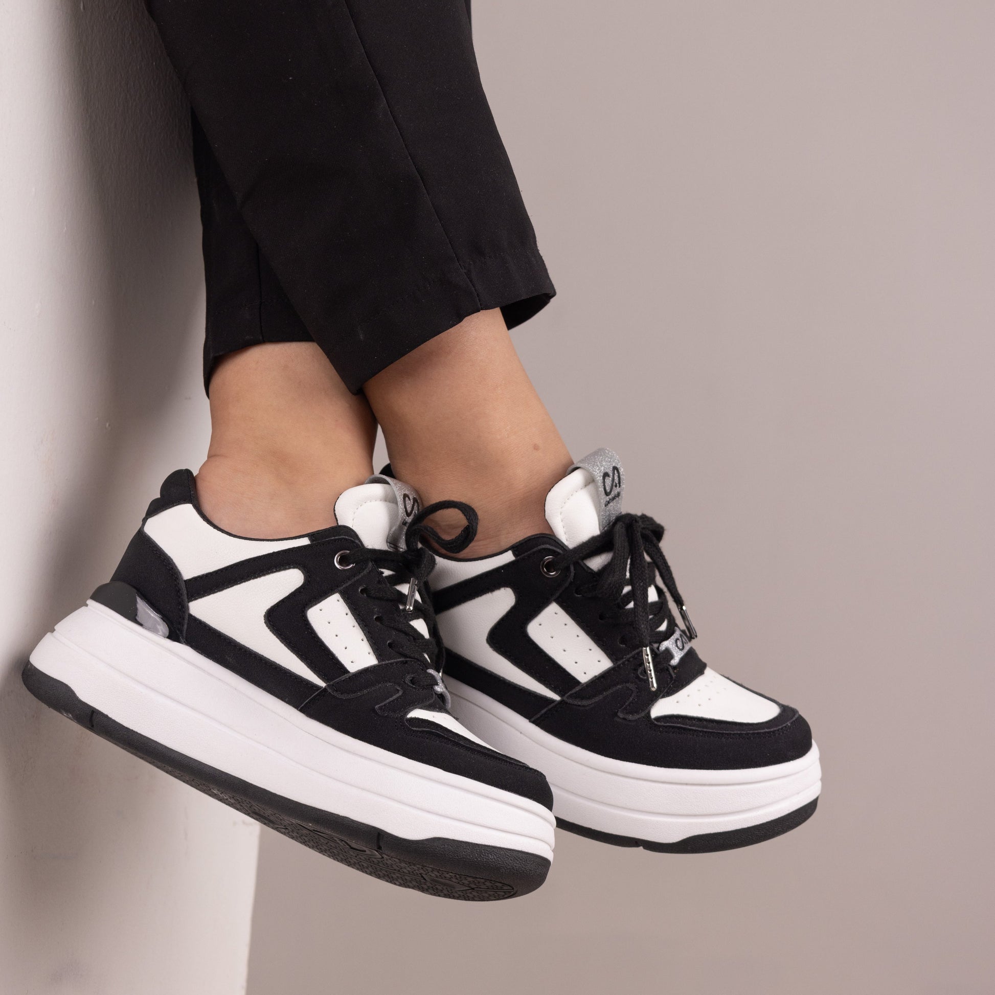 Explora los zapatos CalzAristy ABBI en blanco y negro, un diseño moderno con suela gruesa que fusiona elegancia y comodidad.