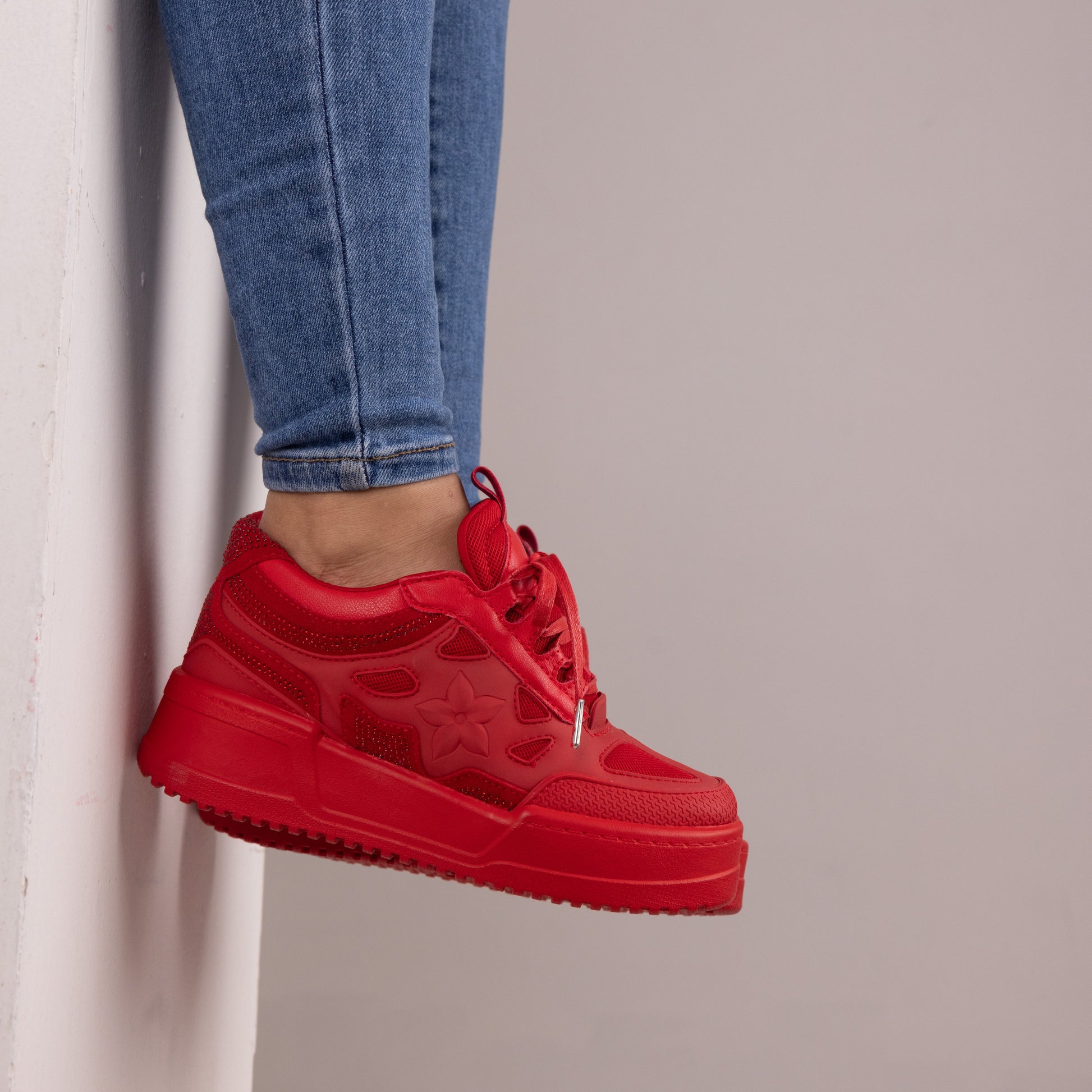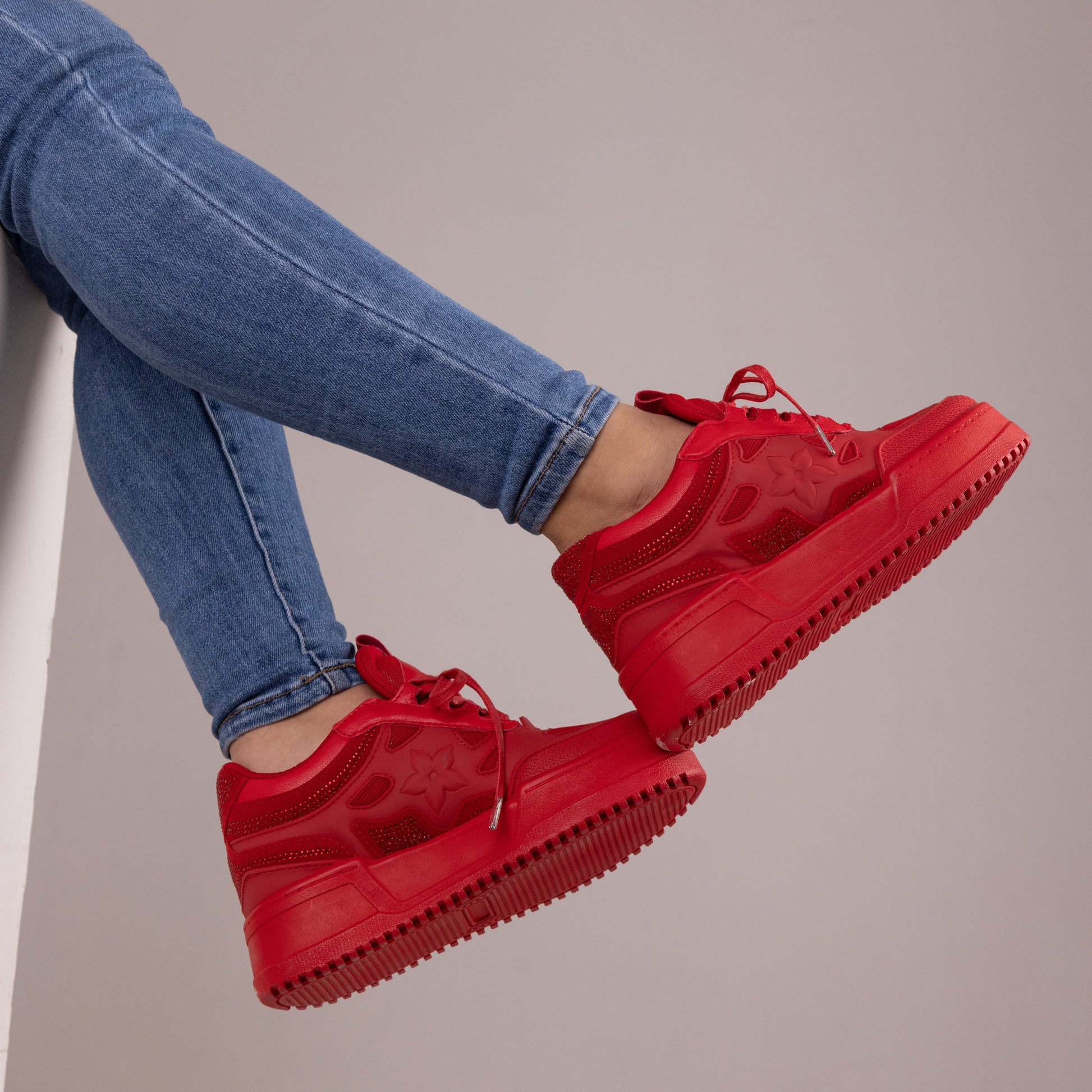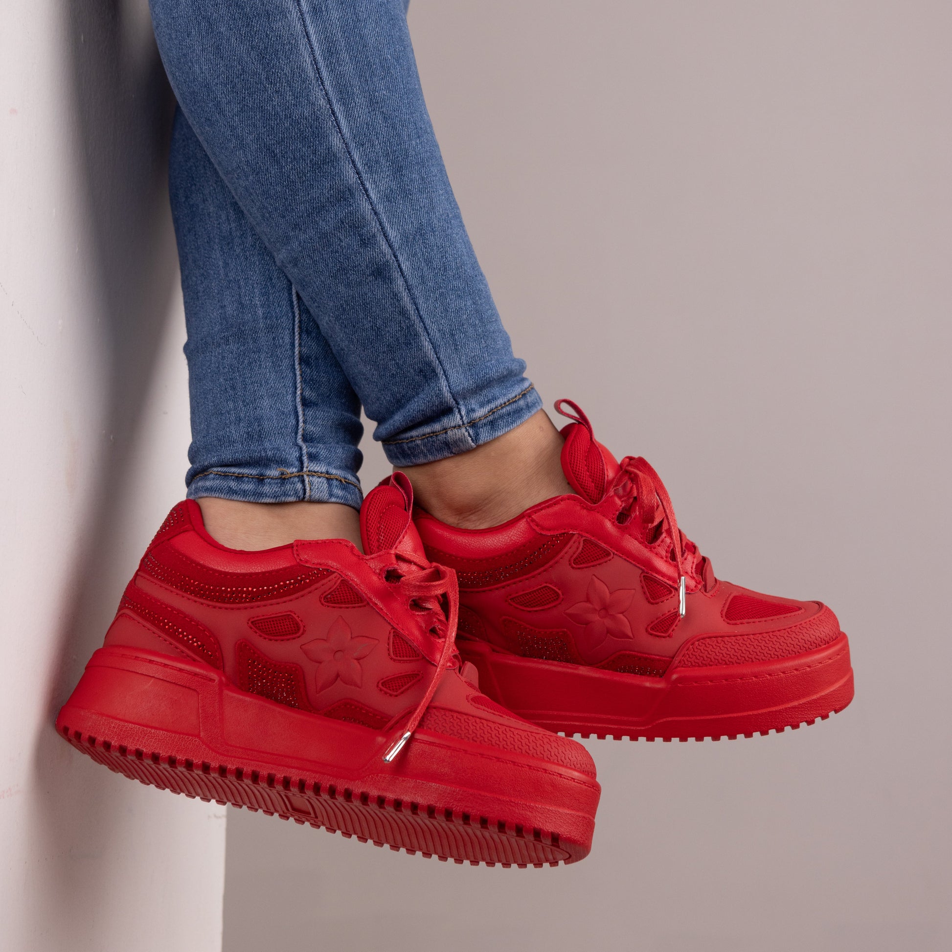 Estos tenis de color rojo combinan un diseño casual y moderno con una plataforma interna que aporta y altura. Los elegantes apliques en sus laterales, el toque de brillo que aportan las piedras tono a tono y su parte trasera agregan un toque cómodo, convirtiéndolos en la opción perfecta para un look estilizado y cómodo. Fabricados con materiales de alta calidad, estos tenis aseguran durabilidad y comodidad durante todo el día. Ideales para combinar con cualquier outfit, desde lo casual hasta lo elegante.