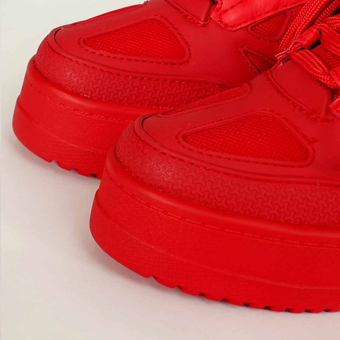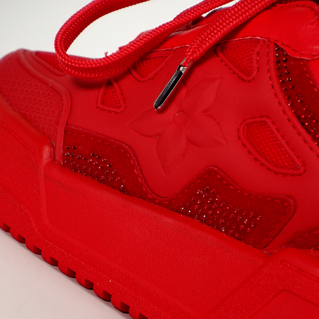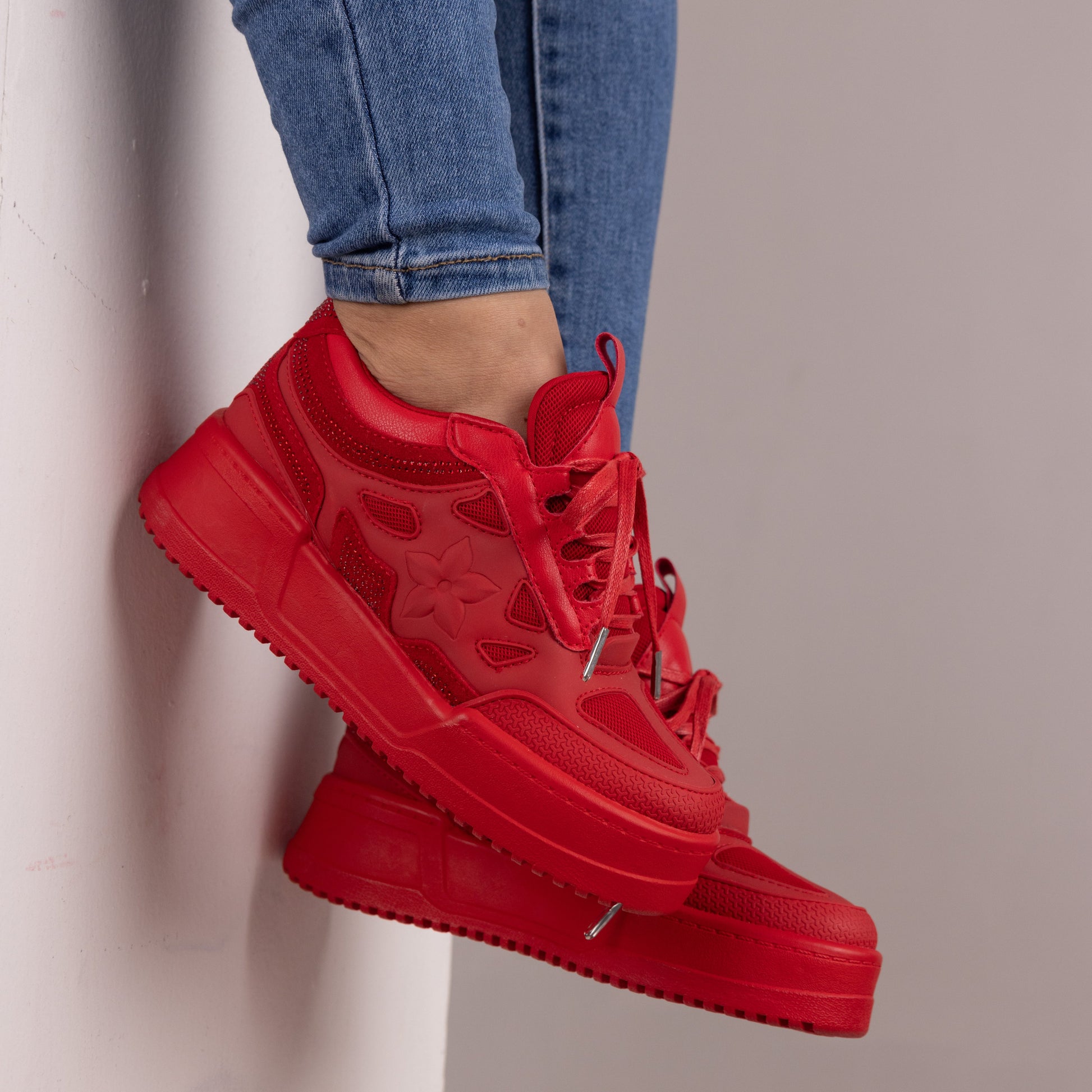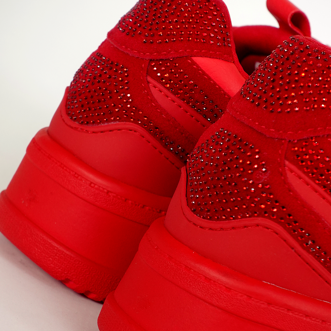 Estos tenis de color rojo combinan un diseño casual y moderno con una plataforma interna que aporta y altura. Los elegantes apliques en sus laterales, el toque de brillo que aportan las piedras tono a tono y su parte trasera agregan un toque cómodo, convirtiéndolos en la opción perfecta para un look estilizado y cómodo. Fabricados con materiales de alta calidad, estos tenis aseguran durabilidad y comodidad durante todo el día. Ideales para combinar con cualquier outfit, desde lo casual hasta lo elegante.