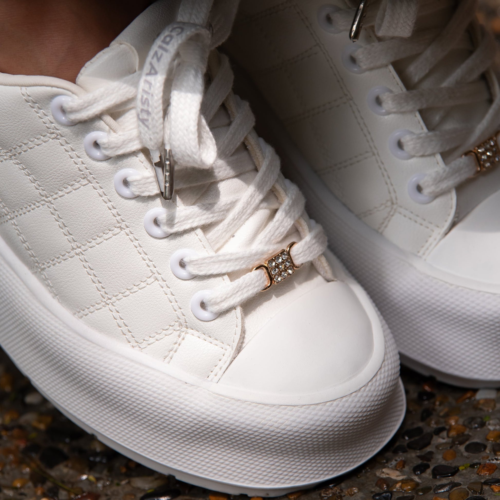 Cuentan con una plataforma blanca ligera, que aporta altura sin sacrificar comodidad, y una puntera resistente que mejora la durabilidad del calzado. Los cordones blancos con el detalle de marca Calzaristy resaltan su personalidad moderna y fresca.