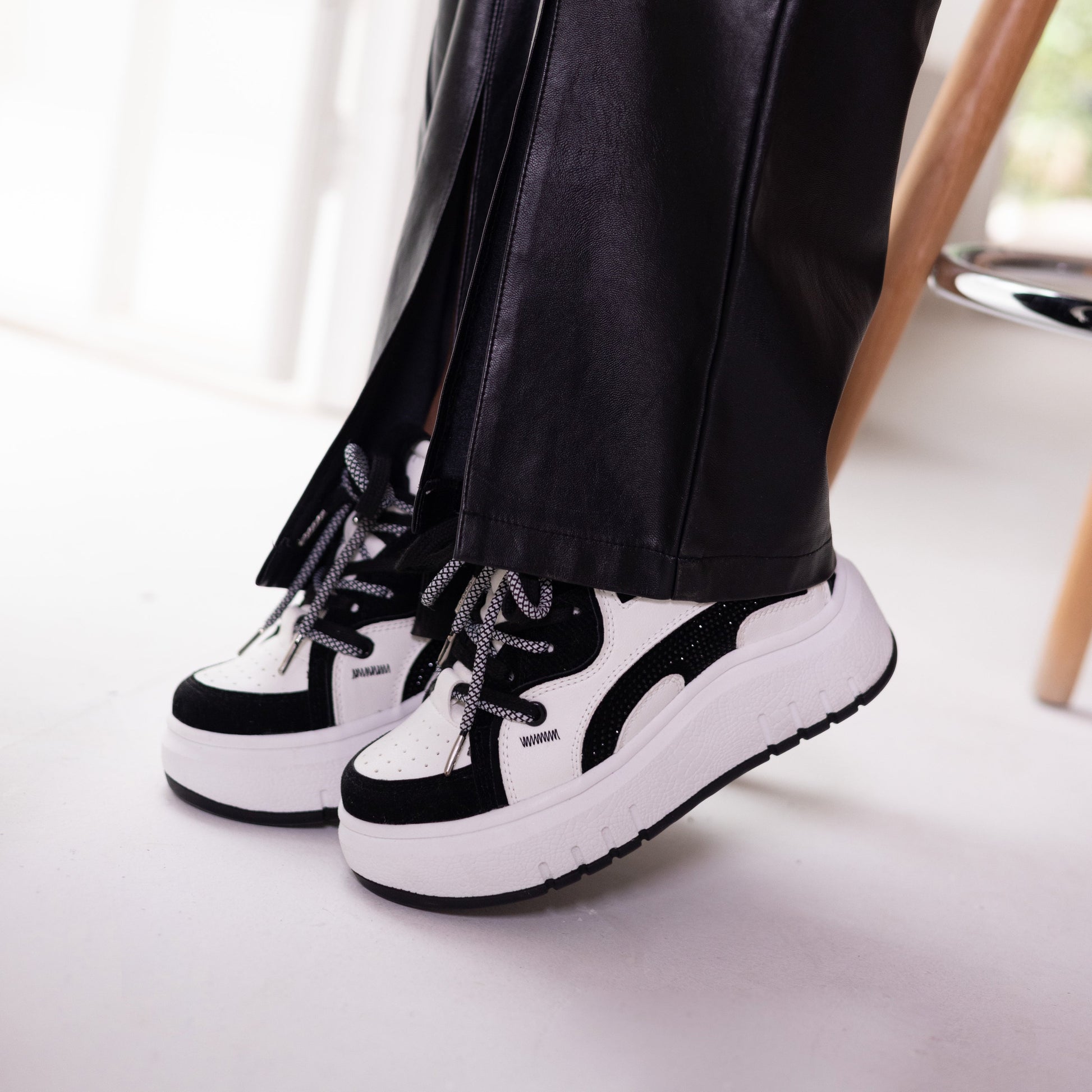 Estos tenis en color blanco con negro combinan un diseño casual y moderno con una plataforma interna que aporta comodidad y altura. Los elegantes apliques de pequeñas piedras brillantes en sus laterales y la combinación del doble cordón agregan un toque sofisticado, convirtiéndolos en la opción perfecta para un look estilizado y cómodo. Fabricados con materiales de alta calidad, estos tenis aseguran durabilidad y confort durante todo el día. Ideales para combinar con cualquier outfit, desde lo casual hasta lo elegante.