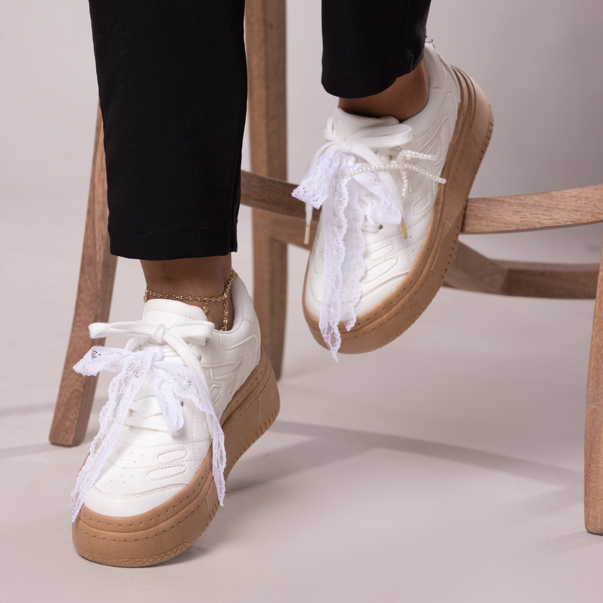 Estos tenis en color blanco combinan un diseño casual y moderno con una plataforma interna que aporta comodidad y altura. La elegante cinta en tela de encaje es un detalle romántico que  agrega un toque sofisticado, convirtiéndolos en la opción perfecta para un look estilizado y cómodo. Fabricados con materiales de alta calidad, estos tenis aseguran durabilidad y confort durante todo el día. Ideales para combinar con cualquier outfit, desde lo casual hasta lo elegante.