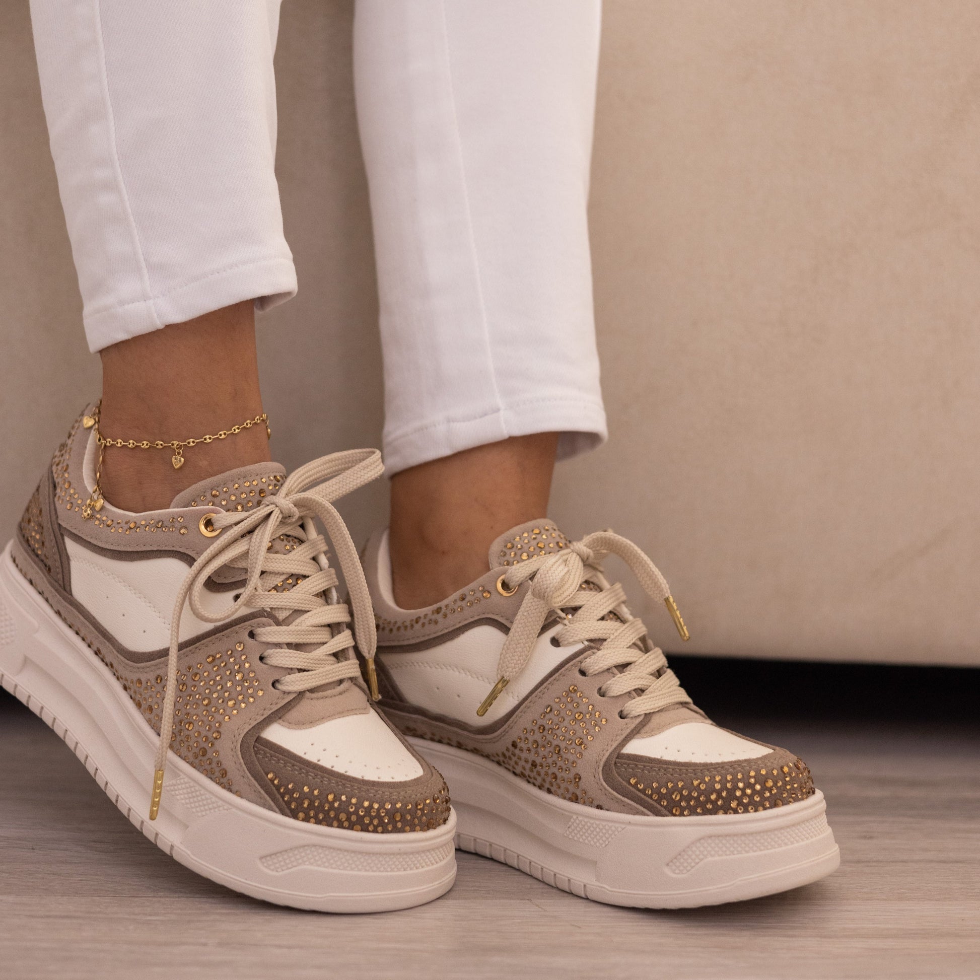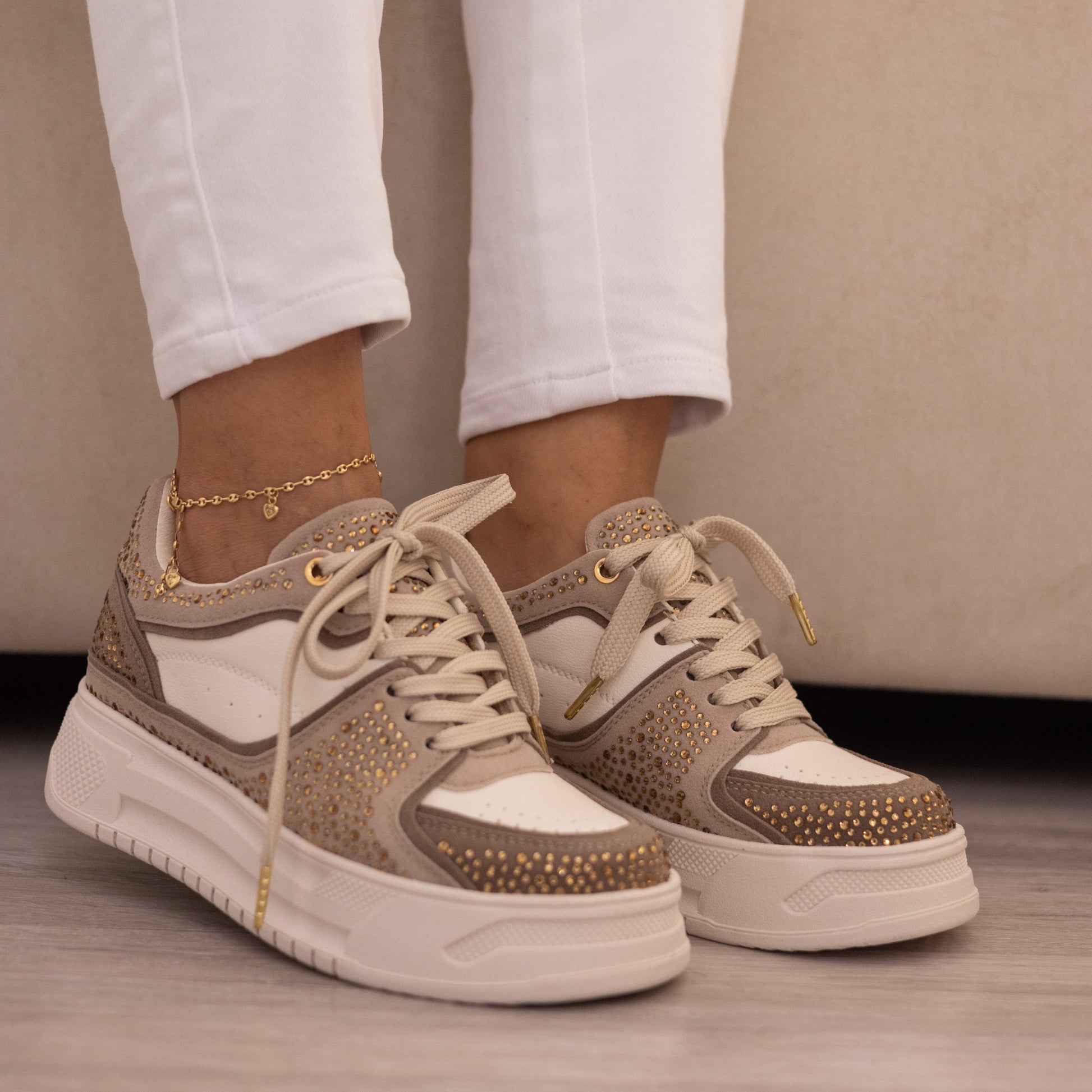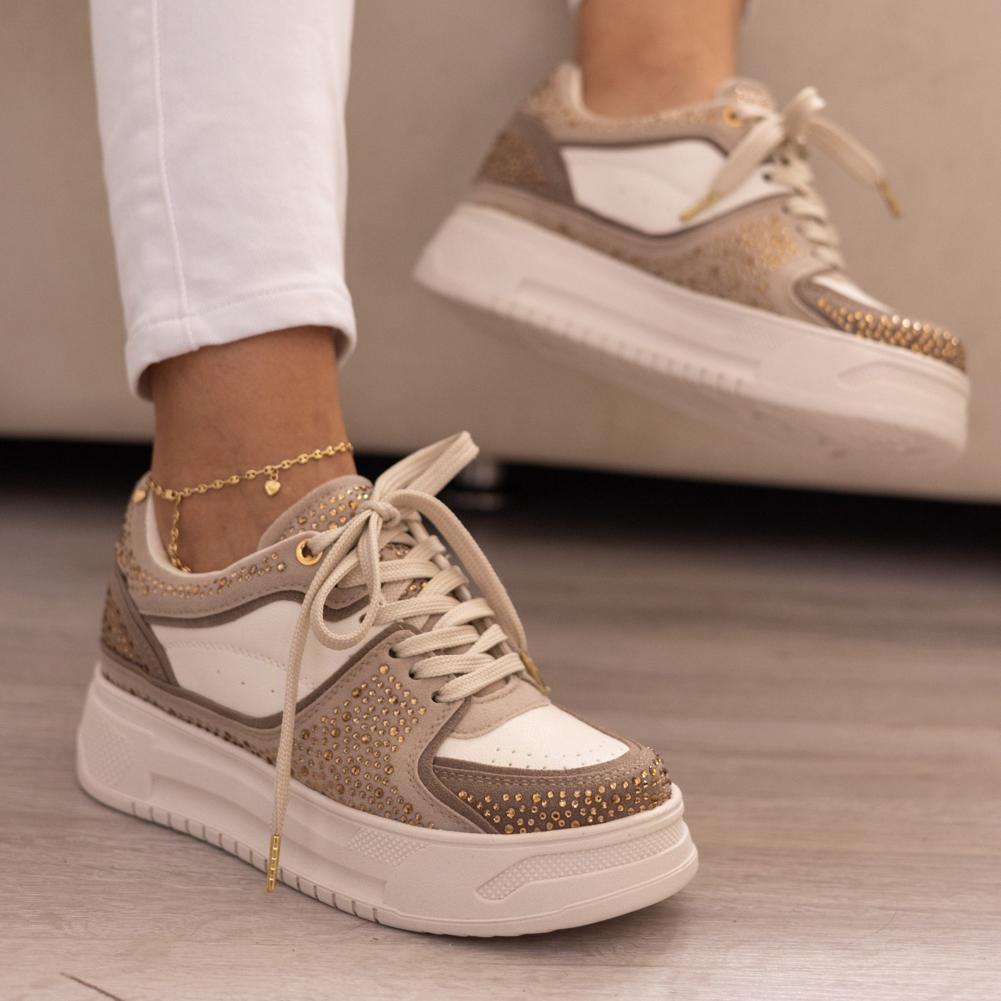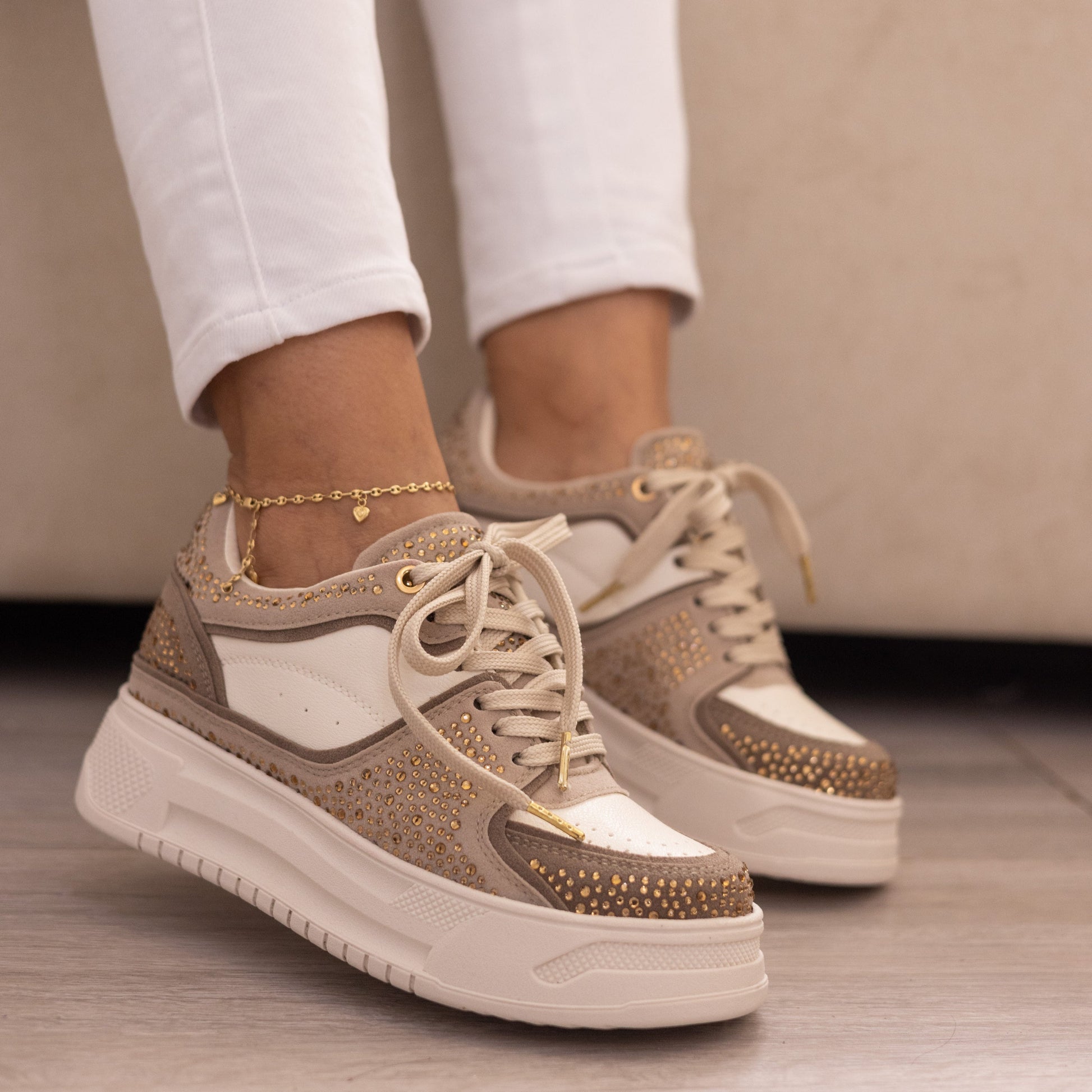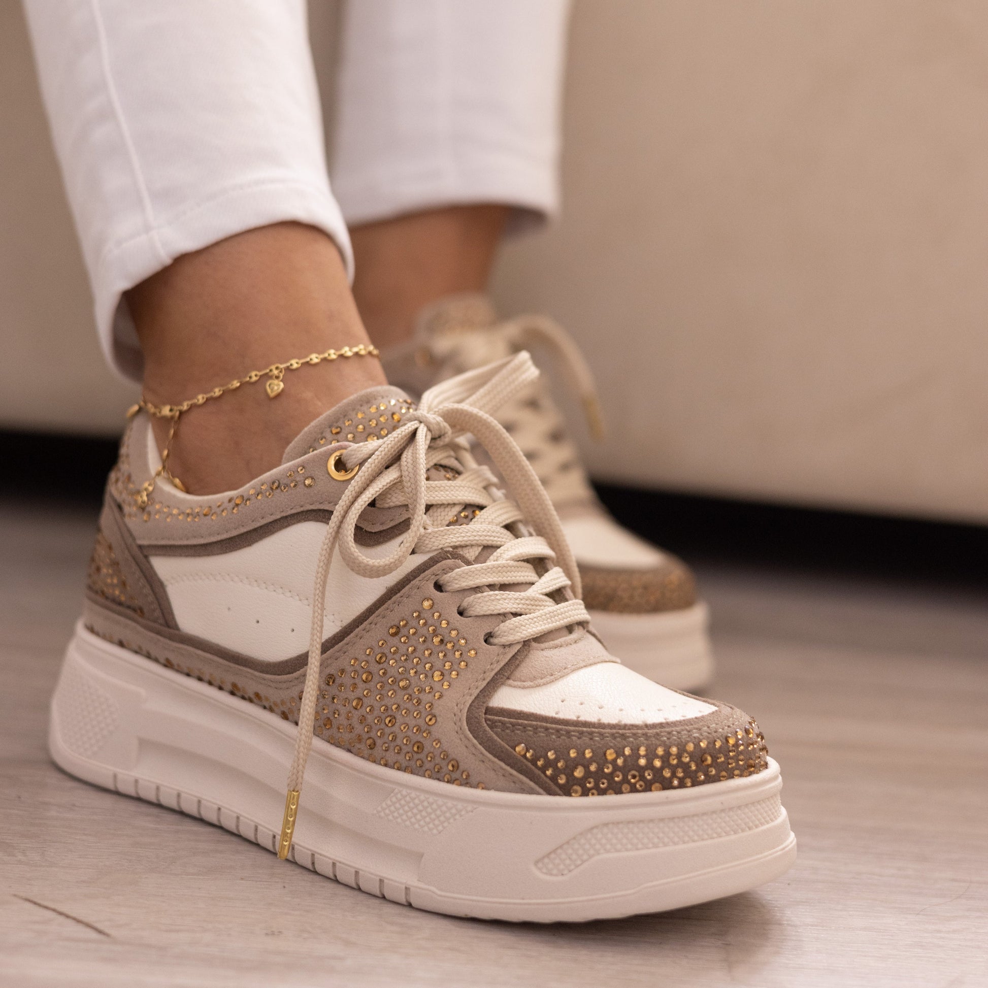 Los GLAM Beige combinan la suavidad de los tonos neutros con destellos dorados que hacen brillar tu estilo en cualquier ocasión. Su diseño con plataforma y textura en gamuza aporta elegancia, comodidad y altura, mientras los apliques dorados elevan cualquier outfit.