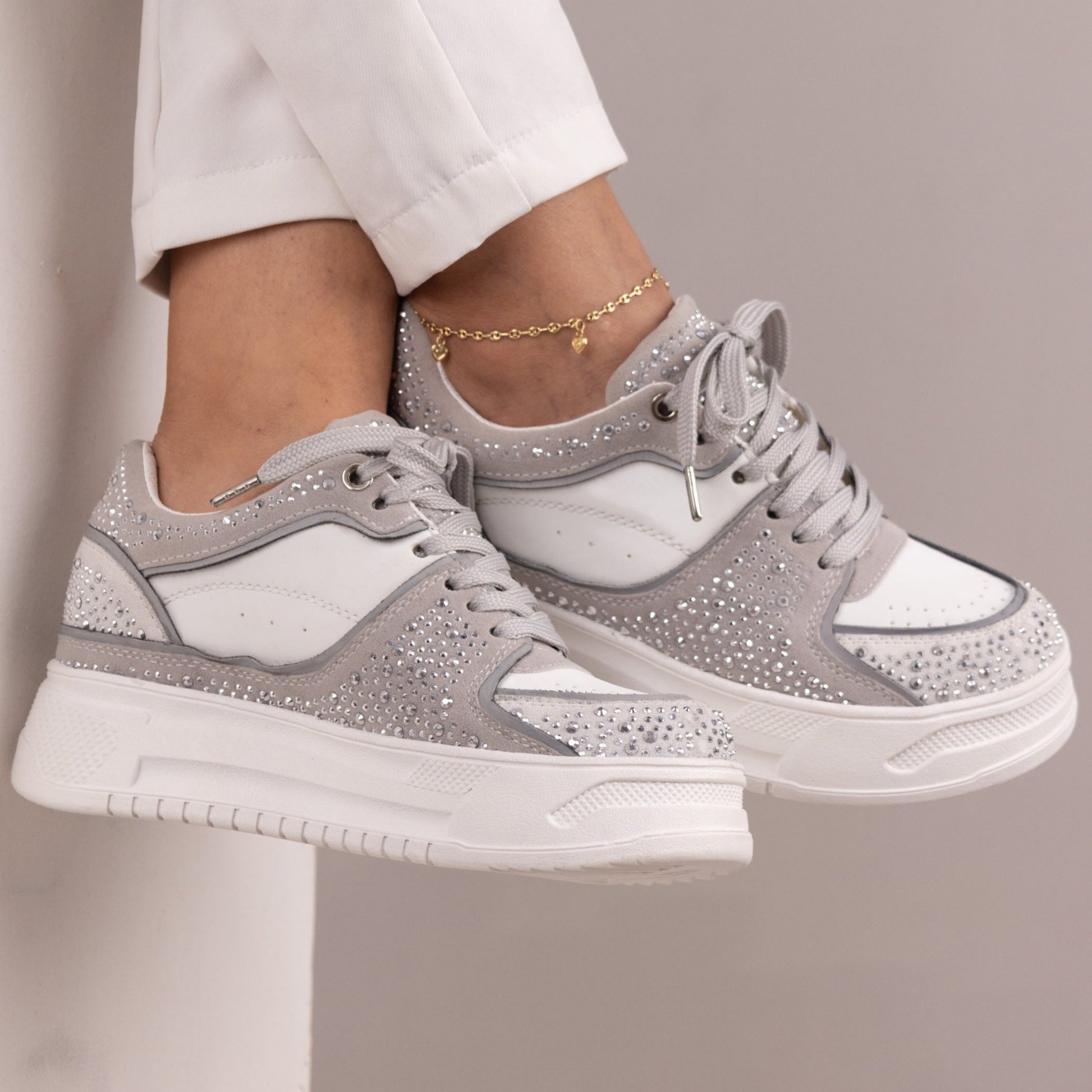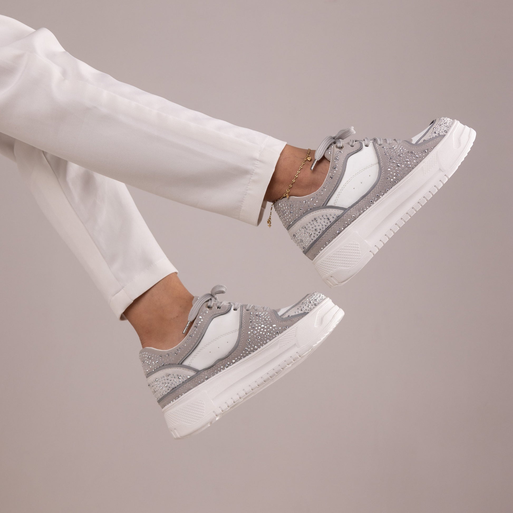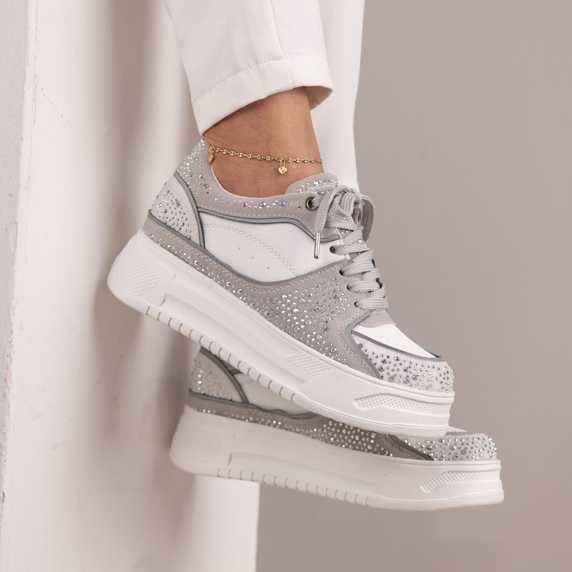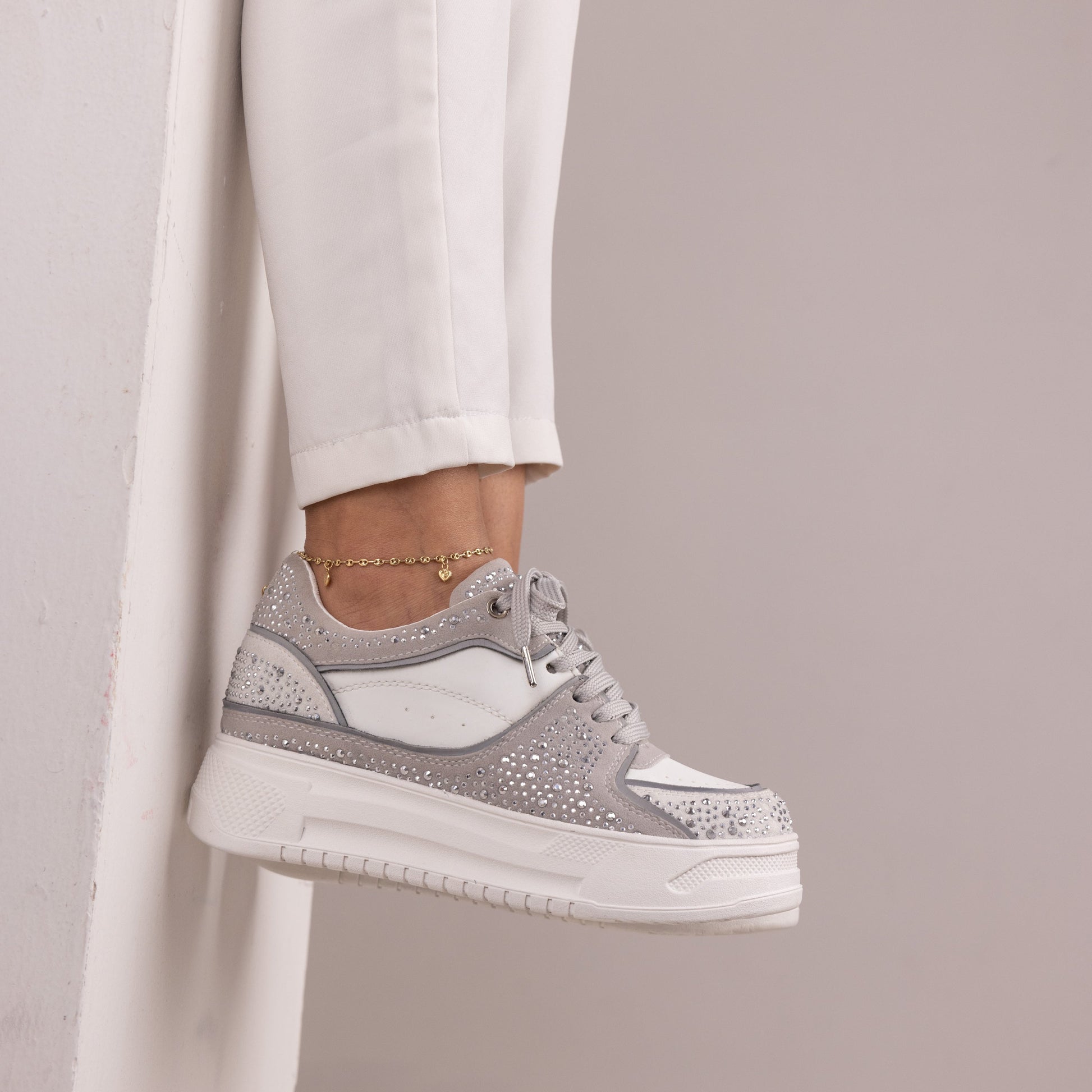Los GLAM Blanco con Gris son sinónimo de sofisticación moderna. Su base blanca combinada con gamuza gris y brillantes plateados crea un contraste limpio, ideal para elevar tus outfits más minimalistas. La plataforma añade altura sin sacrificar comodidad, y el brillo sutil te acompaña de día o de noche.
