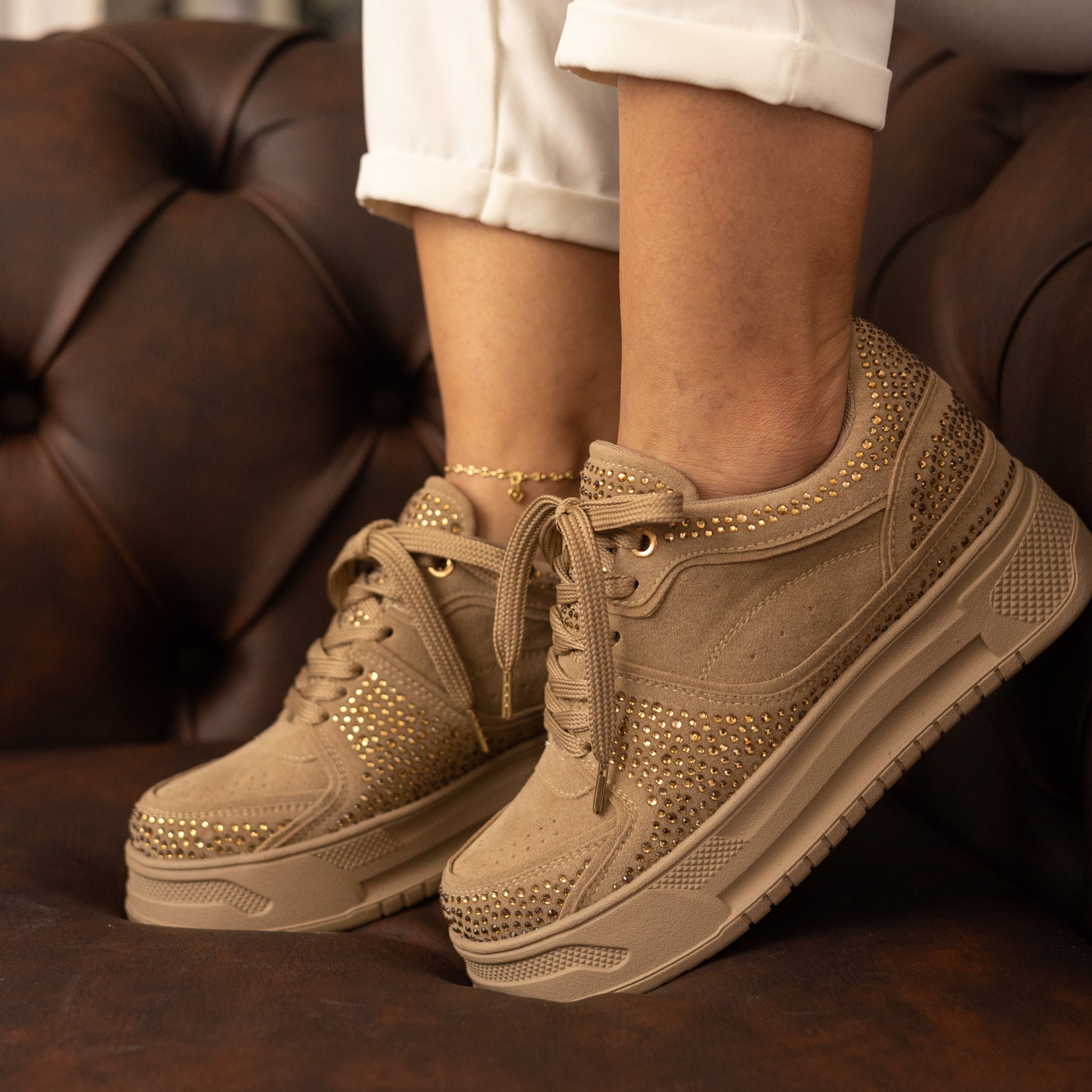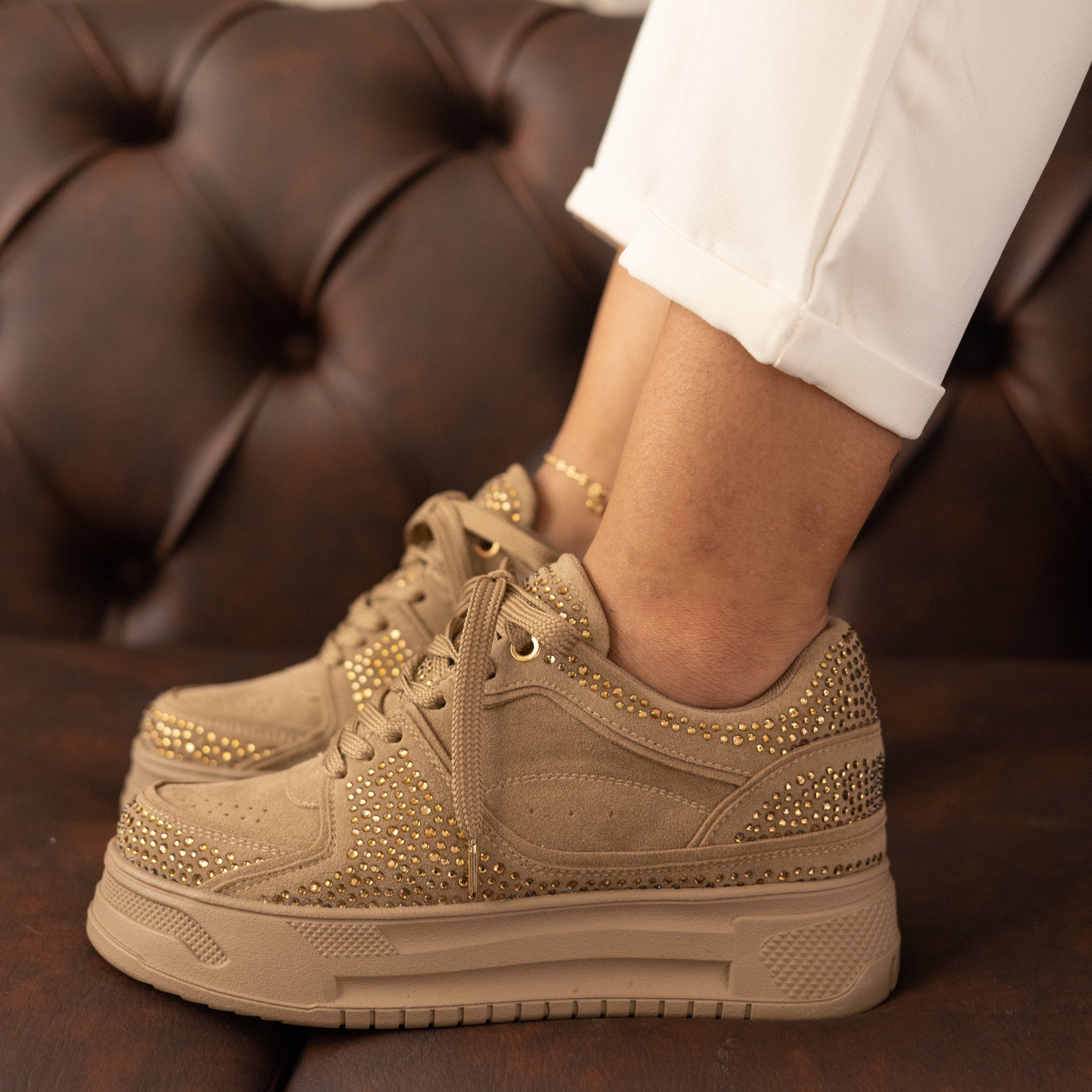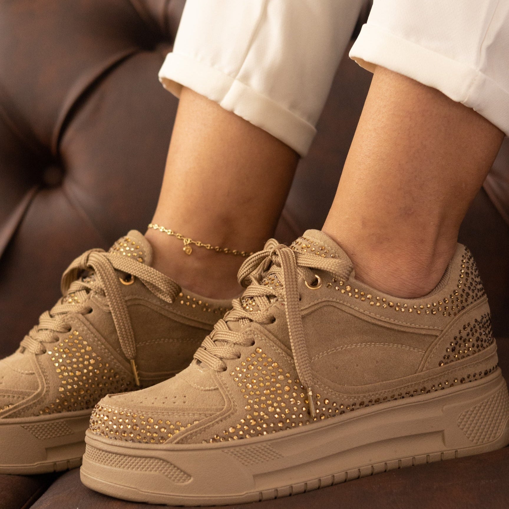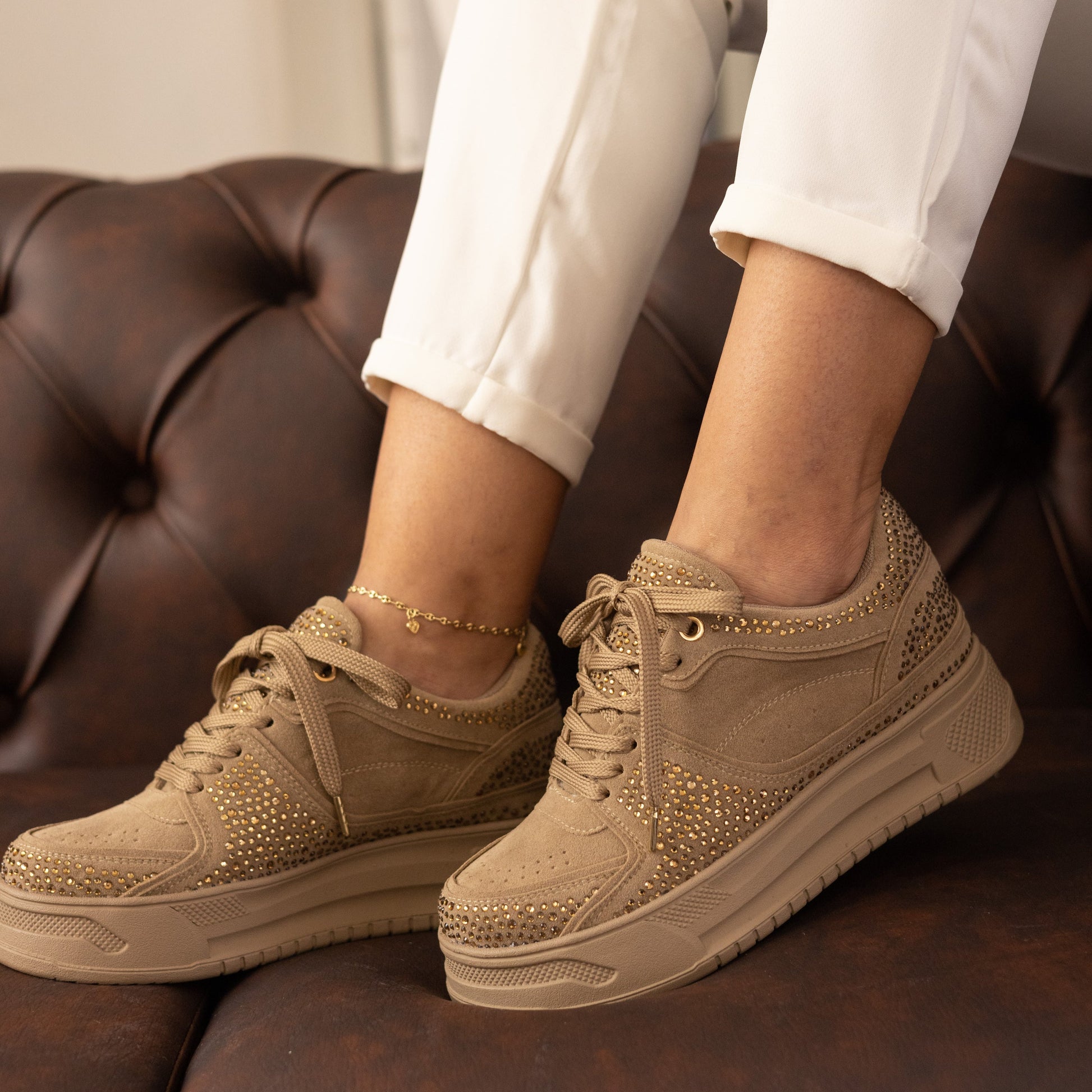 Los GLAM Camel son para las que no quieren pasar desapercibidas. Con un diseño en gamuza camel cubierto de mini brillantes dorados, esta referencia convierte lo casual en impactante. Su plataforma robusta y su tono cálido los hacen ideales para resaltar looks neutros, blancos o incluso total black.
