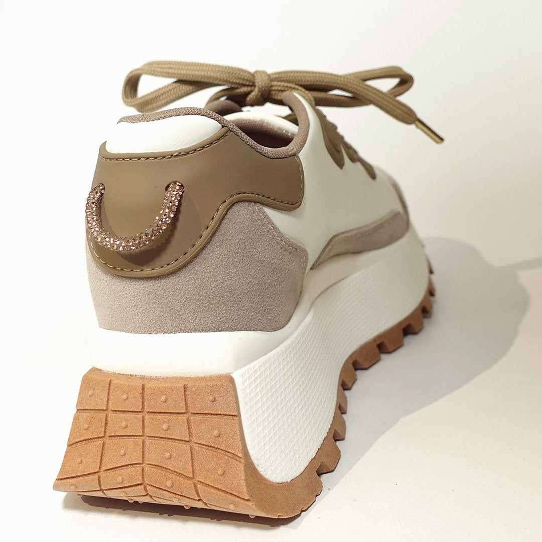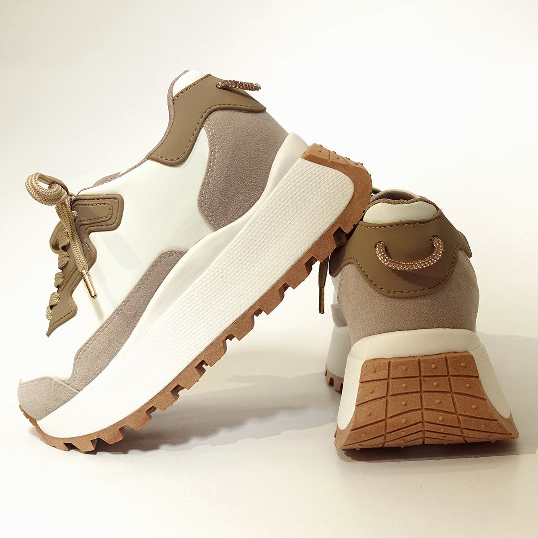 Los CalzAristy GLOW combinan tonos blanco y camel en un diseño contemporáneo que fusiona lo casual con lo sofisticado. Su suela dentada de gran agarre, el contraste de texturas tipo gamuza y cuero sintético, y el detalle trasero con incrustaciones brillantes convierten a este modelo en un ícono de estilo urbano.
