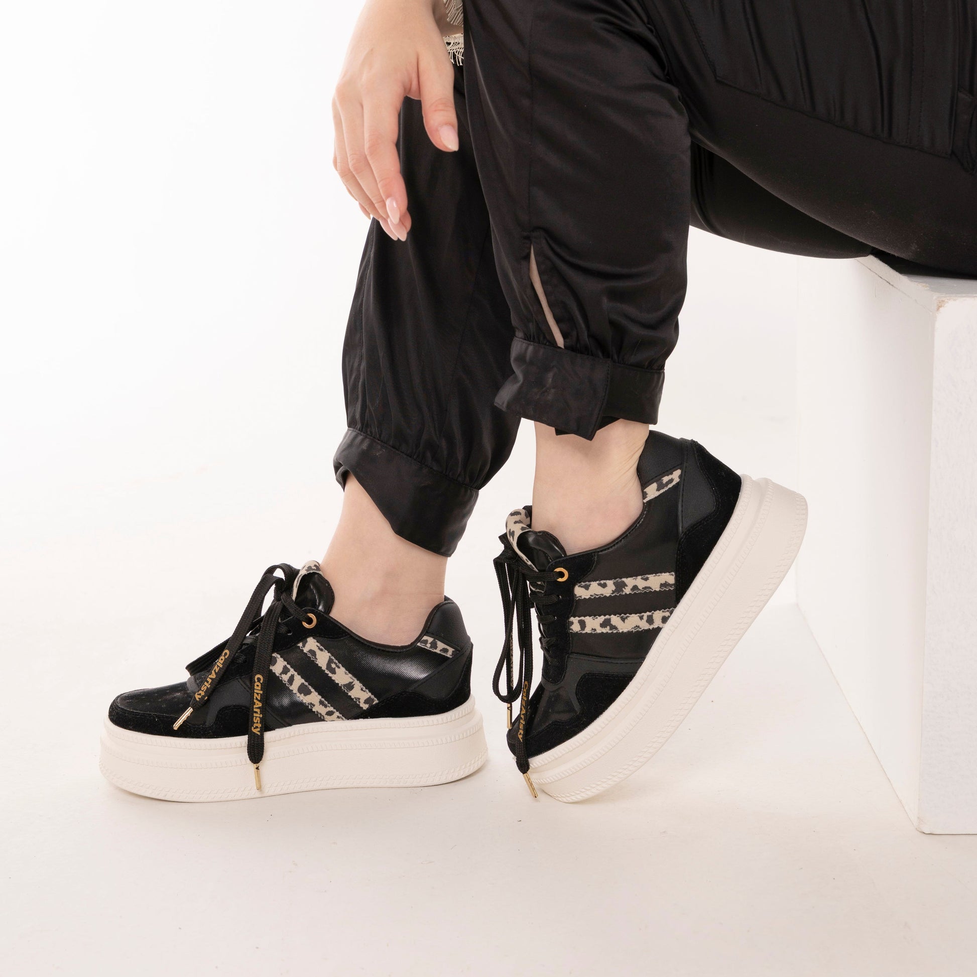 Su diseño combina materiales de acabado brillante y gamuzado en un elegante color negro, enriquecido con detalles en animal print que añaden personalidad, fuerza y tendencia a cualquier outfit. Las tiras laterales estampadas, junto con los herrajes en tono dorado y los cordones personalizados de Calzaristy, hacen que los Maya destaquen con un look único y sofisticado.