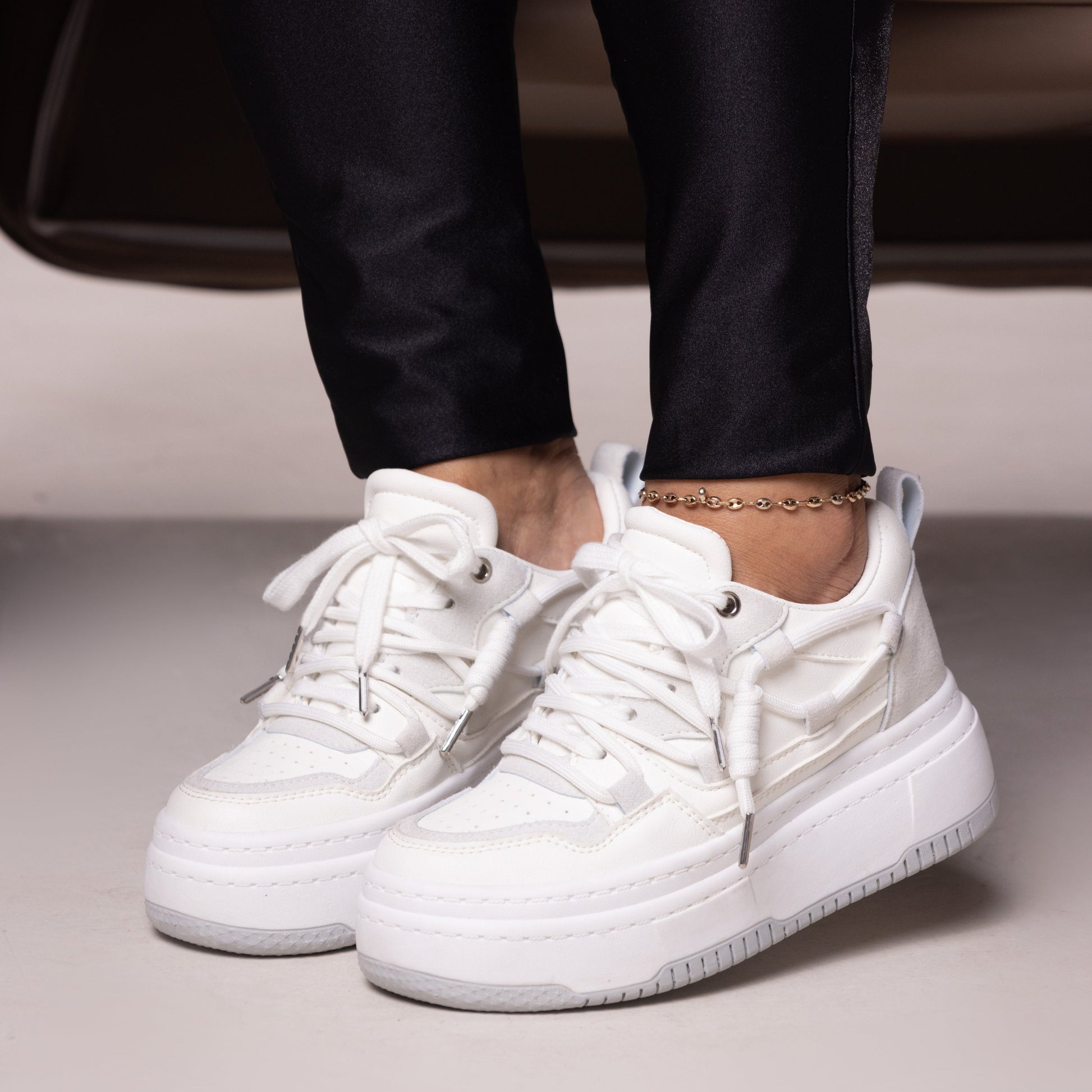 Estos tenis en color blanco combinan un diseño casual y moderno, inspirado en la tendencia de los metalizados, con una plataforma interna que aporta comodidad y altura. la forma en la que llevan los cordones agregan un toque cómodo, convirtiéndolos en la opción perfecta para un look estilizado y cómodo. Fabricados con materiales de alta calidad, estos tenis aseguran durabilidad y comodidad durante todo el día. Ideales para combinar con cualquier outfit, desde lo casual hasta lo elegante.