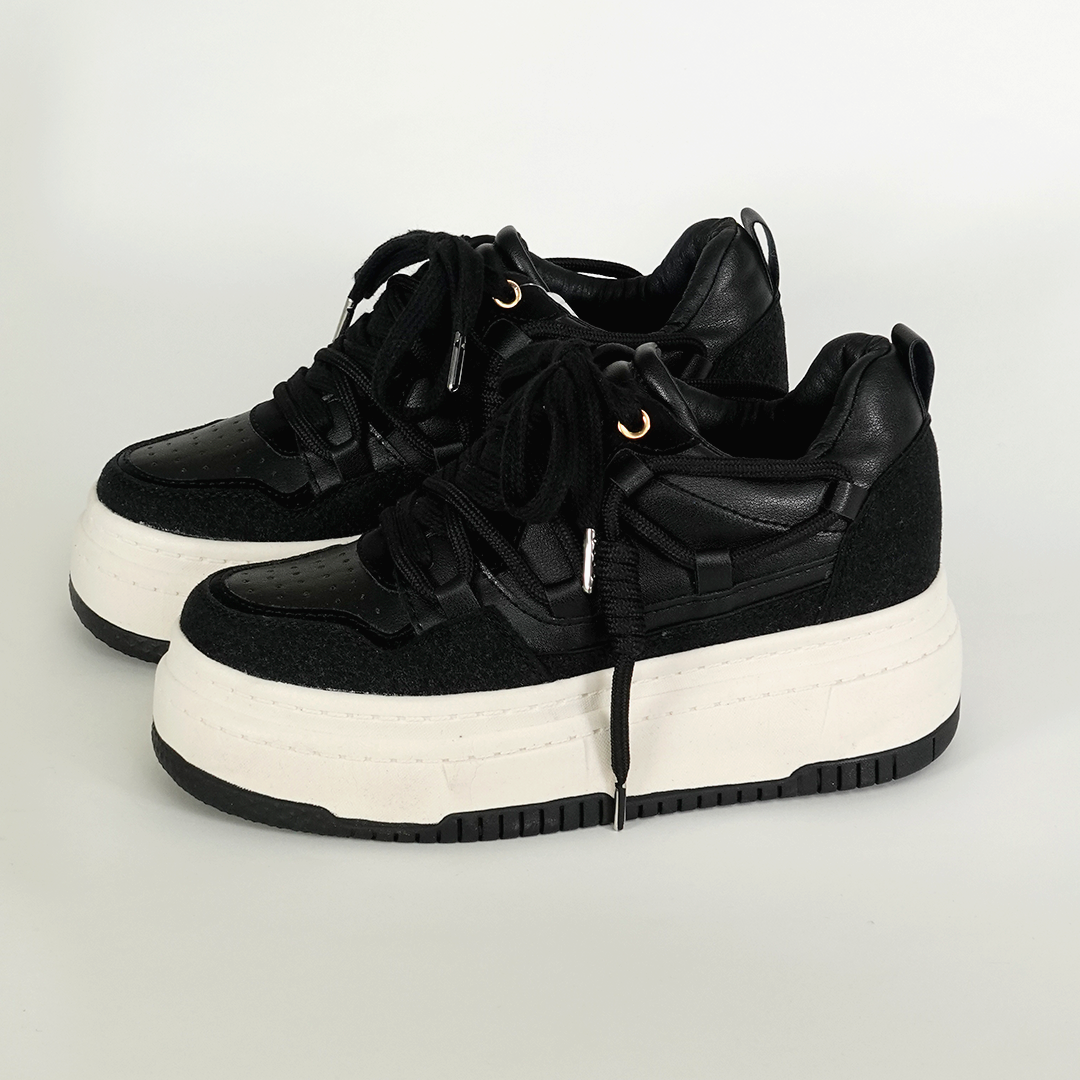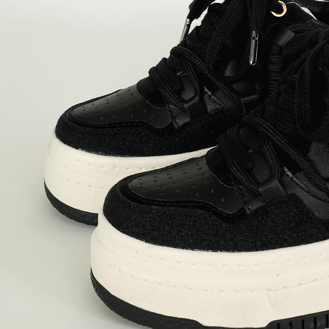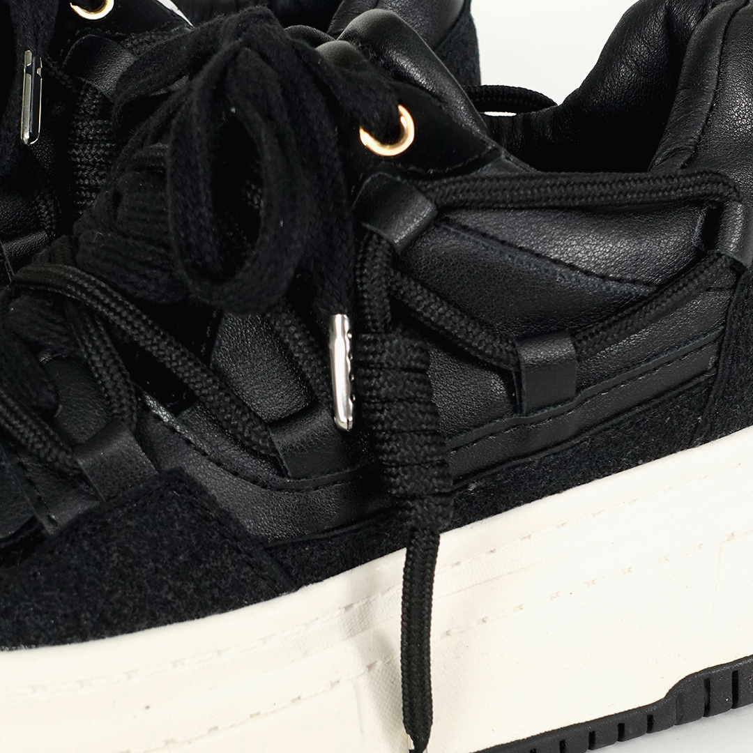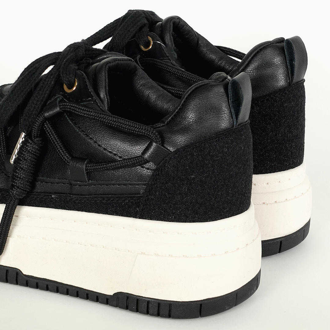 Estos tenis en color negro combinan un diseño casual y moderno, inspirado en la tendencia de los metalizados, con una plataforma interna que aporta comodidad y altura. Los elegantes apliques en charol tono a tono y la forma en la que llevan los cordones agregan un toque cómodo, convirtiéndolos en la opción perfecta para un look estilizado y cómodo. Fabricados con materiales de alta calidad, estos tenis aseguran durabilidad y comodidad durante todo el día. Ideales para combinar con cualquier outfit, desde lo casual hasta lo elegante.