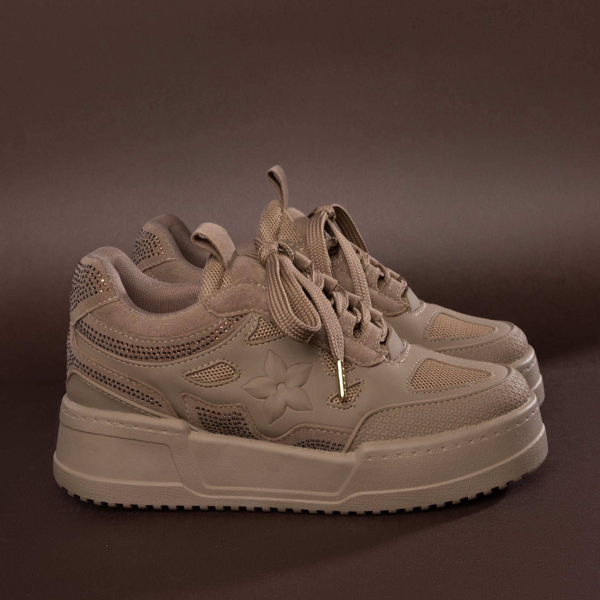 Estos tenis en color camel combinan un diseño casual y moderno con una plataforma interna que aporta y altura. Los elegantes apliques en sus laterales, el toque de brillo que aportan las piedras tono a tono y su parte trasera agregan un toque cómodo, convirtiéndolos en la opción perfecta para un look estilizado y cómodo. Fabricados con materiales de alta calidad, estos tenis aseguran durabilidad y comodidad durante todo el día. Ideales para combinar con cualquier outfit, desde lo casual hasta lo elegante.