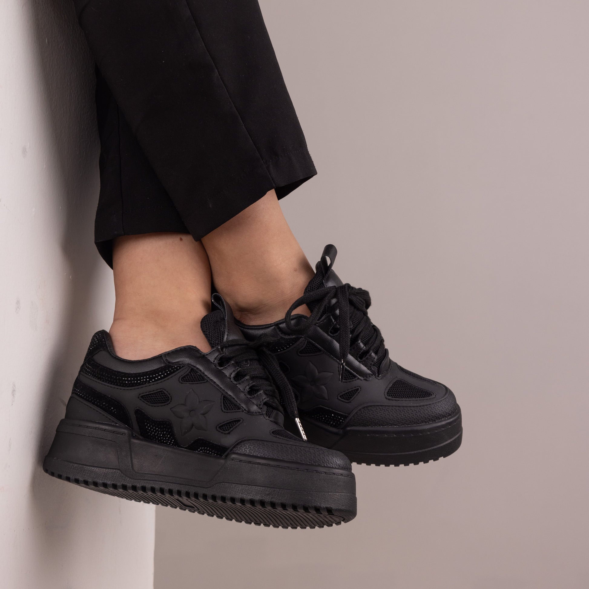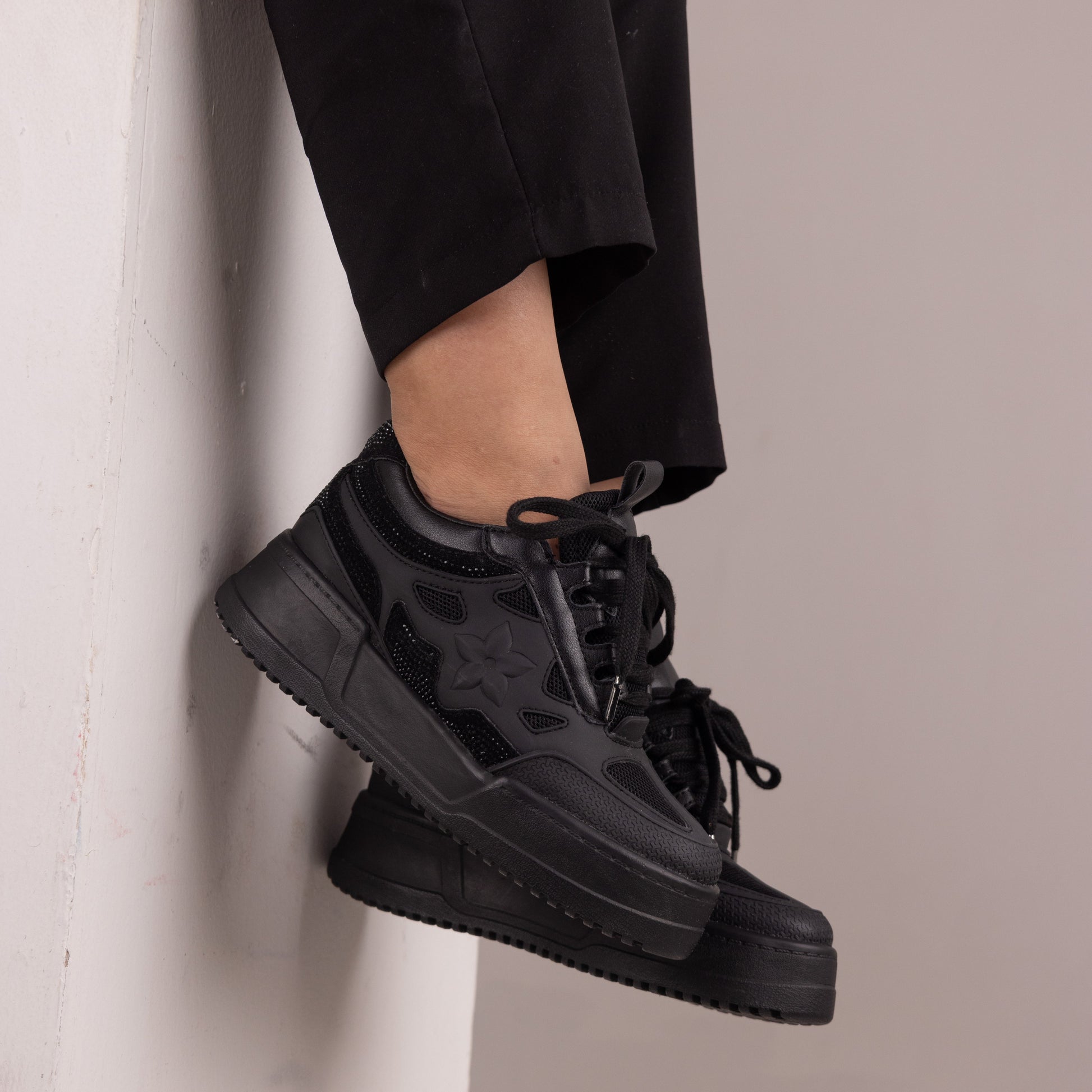 Estos tenis en color negro combinan un diseño casual y moderno con una plataforma interna que aporta y altura. Los elegantes apliques en sus laterales, el toque de brillo que aportan las piedras tono a tono y su parte trasera agregan un toque cómodo, convirtiéndolos en la opción perfecta para un look estilizado y cómodo. Fabricados con materiales de alta calidad, estos tenis aseguran durabilidad y comodidad durante todo el día. Ideales para combinar con cualquier outfit, desde lo casual hasta lo elegante.