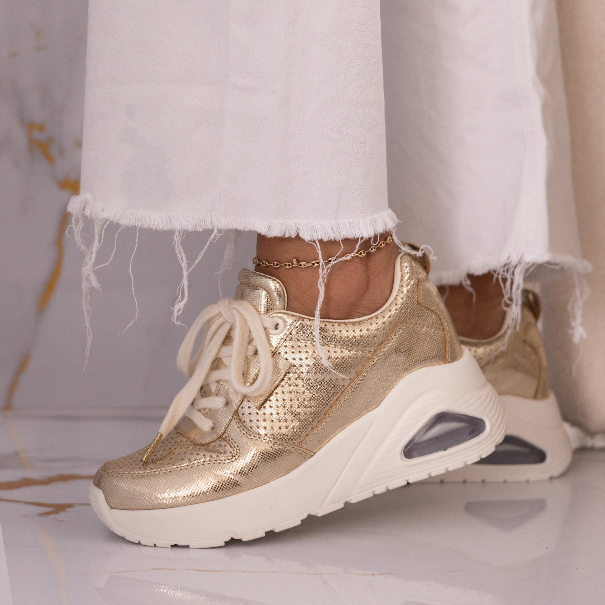 Estos tenis en color dorado combinan un diseño casual y moderno, inspirados en la tendencia de los metalizados, con una plataforma interna que aporta comodidad y altura. Los elegantes materiales metalizados agregan un toque sofisticado, convirtiéndolos en la opción perfecta para un look estilizado y cómodo. Fabricados con materiales de alta calidad, estos tenis aseguran durabilidad y confort durante todo el día. Ideales para combinar con cualquier outfit, desde lo casual hasta lo elegante.