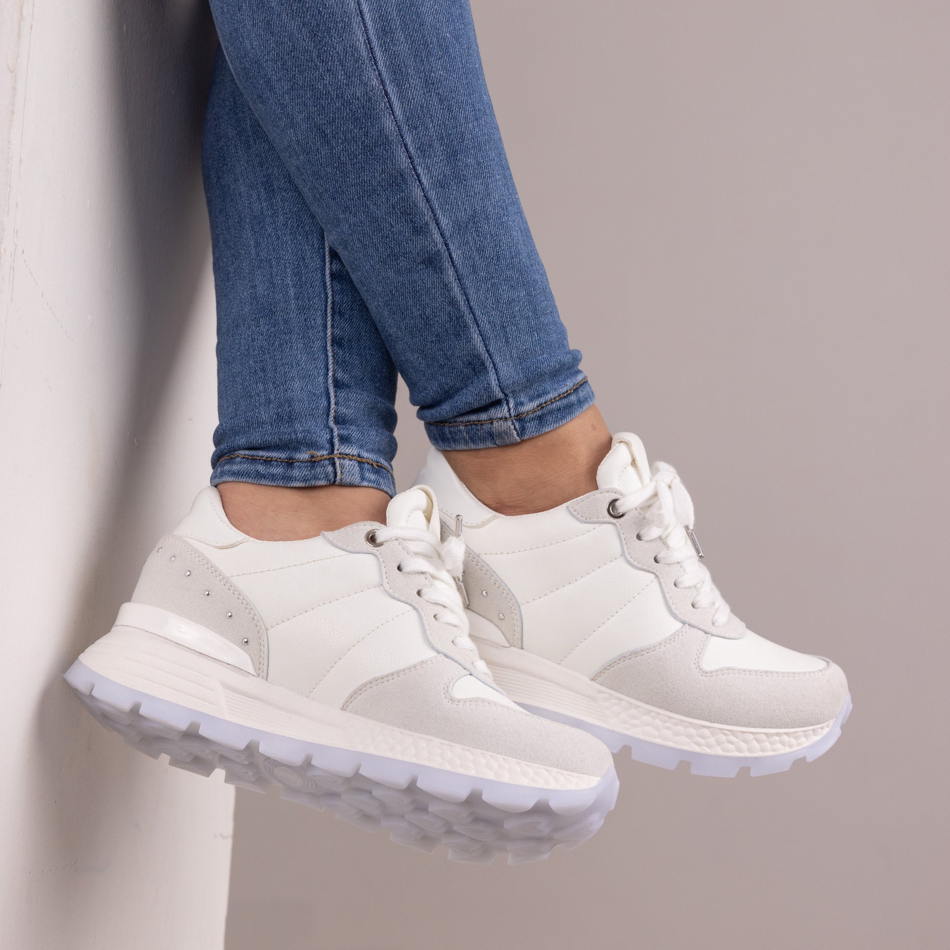 Estos tenis en color blanco combinan un diseño clásico y casual con una plataforma interna que aporta comodidad y altura. Los elegantes taches en su talonera agregan un toque sofisticado, convirtiéndolos en la opción perfecta para un look estilizado y cómodo. Fabricados con materiales de alta calidad, estos tenis aseguran durabilidad y confort durante todo el día. Ideales para combinar con cualquier outfit, desde lo casual hasta lo elegante.