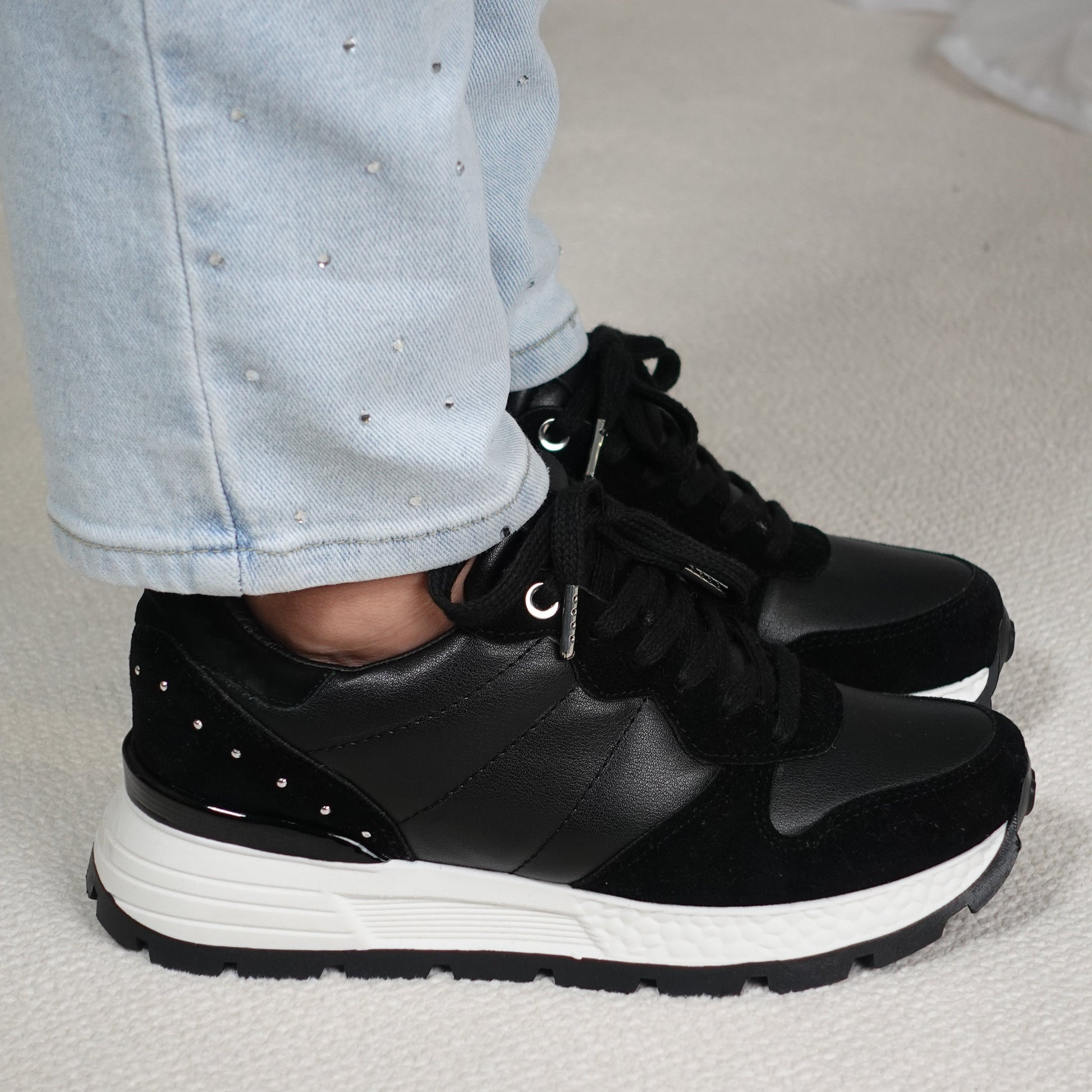 Estos tenis en color negro combinan un diseño clásico y casual con una plataforma interna que aporta comodidad y altura. Los elegantes taches en su talonera agregan un toque sofisticado, convirtiéndolos en la opción perfecta para un look estilizado y cómodo. Fabricados con materiales de alta calidad, estos tenis aseguran durabilidad y confort durante todo el día. Ideales para combinar con cualquier outfit, desde lo casual hasta lo elegante.