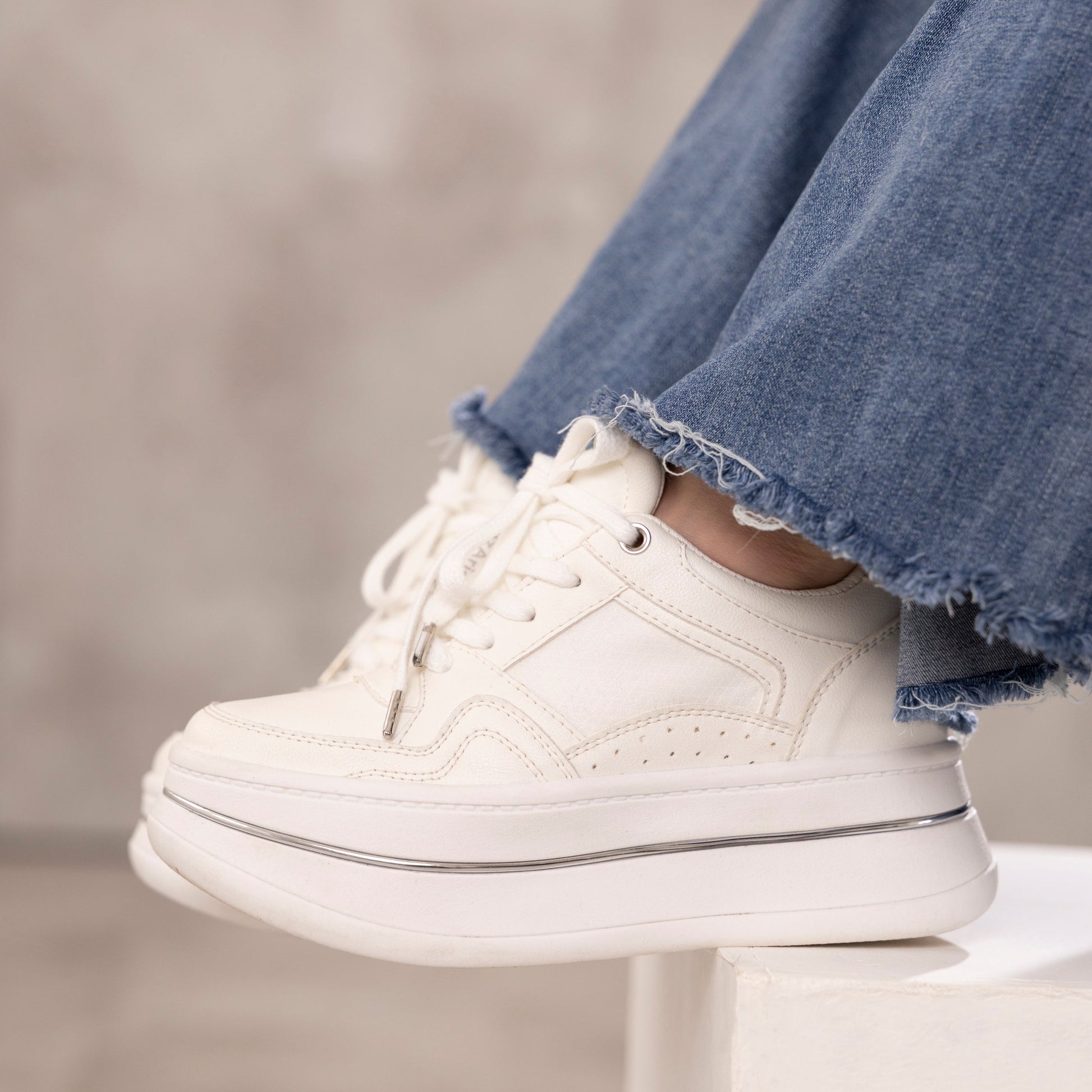 Diseñados en un elegante tono blanco, estos tenis elevan cualquier look con su silueta moderna y su suela robusta que aporta unos centímetros extra sin sacrificar la comodidad.