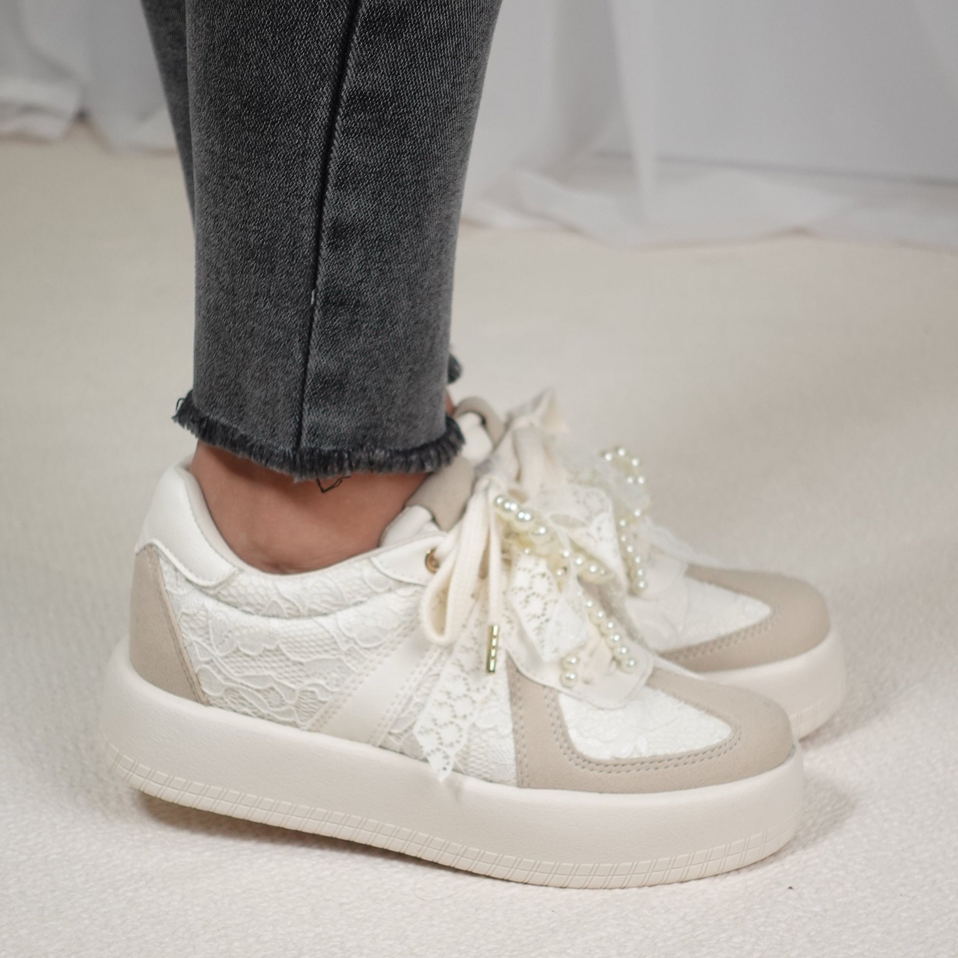 Tenis casuales tendencia boho con detalles en encaje y perlas THALIA Beige