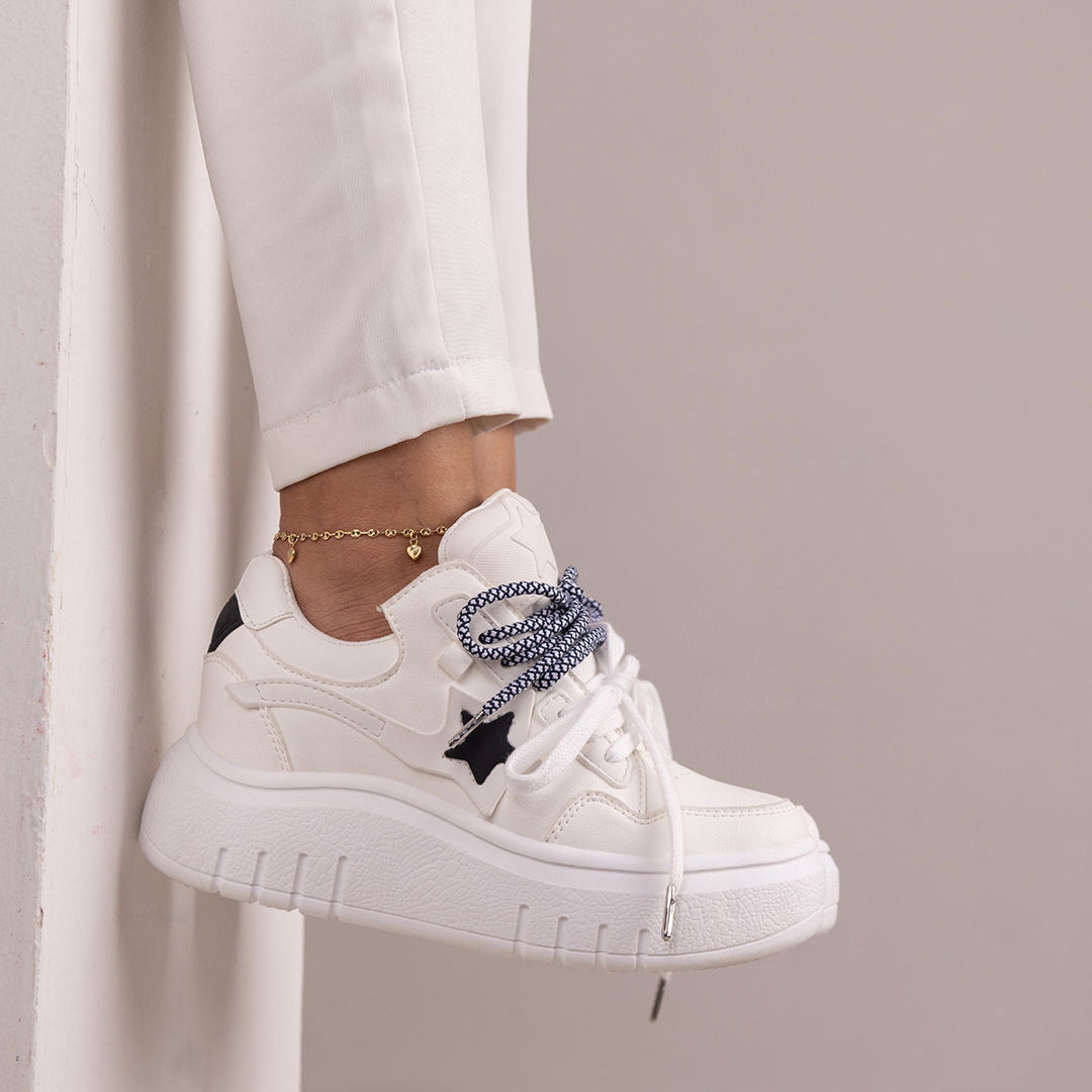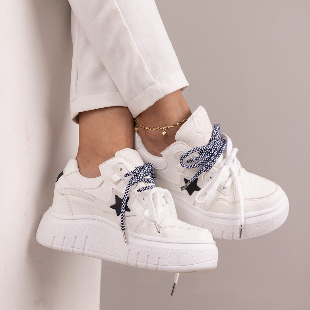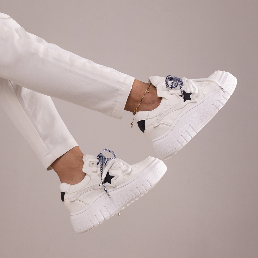 Los Zapatos de Mujer CalzAristy VIVIAN Blanco combinan lo mejor del diseño urbano con una estética limpia y poderosa. Su suela gruesa en tono blanco, detalles de estrella lateral y contraste de texturas crean un look moderno, fresco y lleno de personalidad.