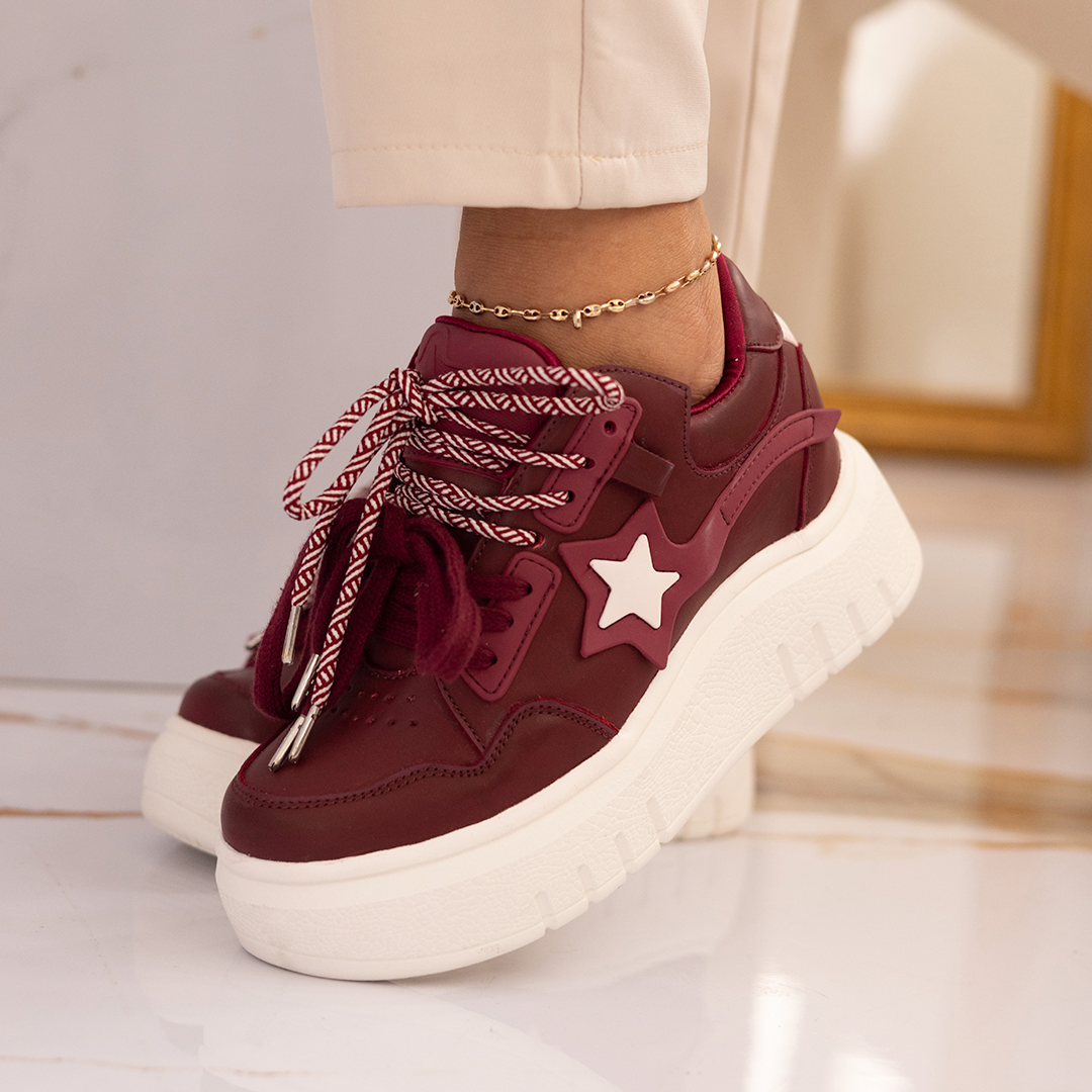 Los Zapatos de Mujer CalzAristy VIVIAN Vinotinto son la elección perfecta para quienes quieren caminar con seguridad, estilo y una dosis de audacia. Su suela chunky en contraste blanco, estrella lateral y diseño envolvente crean una silueta moderna con mucho carácter.